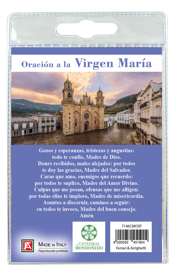 Il Portachiavi è confezionato in un blister con all'interno un immagine della Basilica sul cui retro e' stampata una preghiera in spagnolo.