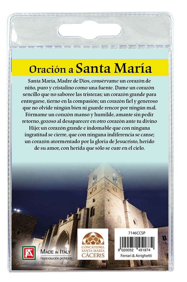 Il Portachiavi è confezionato in un blister con all'interno un immagine della Basilica sul cui retro e' stampata una preghiera in spagnolo.