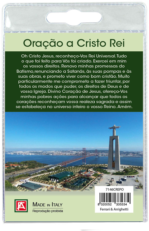 Il Portachiavi è confezionato in un blister con all'interno un immagine del Cristo Rei sul cui retro e' stampata una preghiera in portoghese.