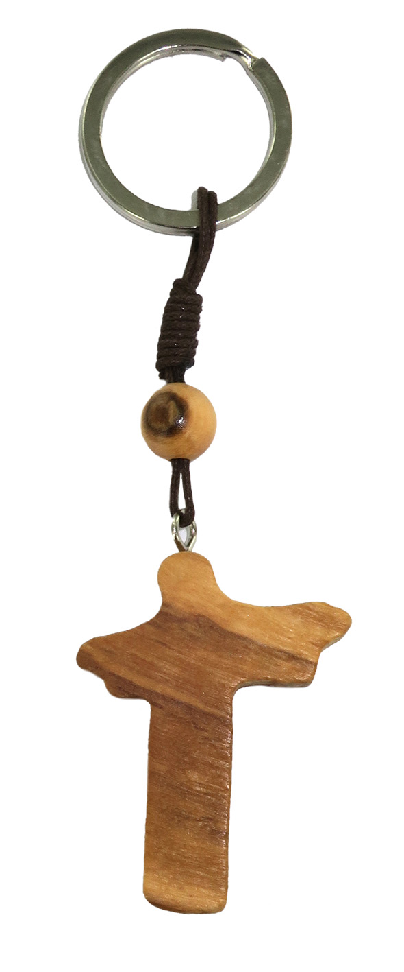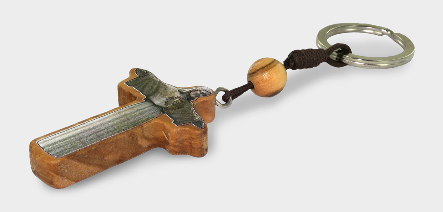 Portachiavi realizzato in legno d'ulivo con l'immagine di Cristo Rei serigrafata, e con un originale grano, anche in legno d'ulivo.