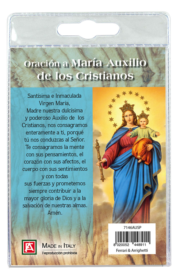 Il Portachiavi è confezionato in un blister con all'interno un immagine della Madonna Ausiliatrice sul cui retro è stampata una preghiera in spagnolo.