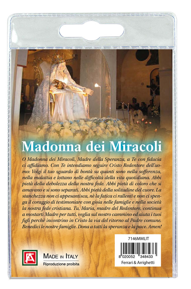 Il Portachiavi è confezionato in un blister con all'interno un immagine del santuario sul cui retro è stampata una preghiera, in italiano, dedicata alla Madonna dei Miracoli.