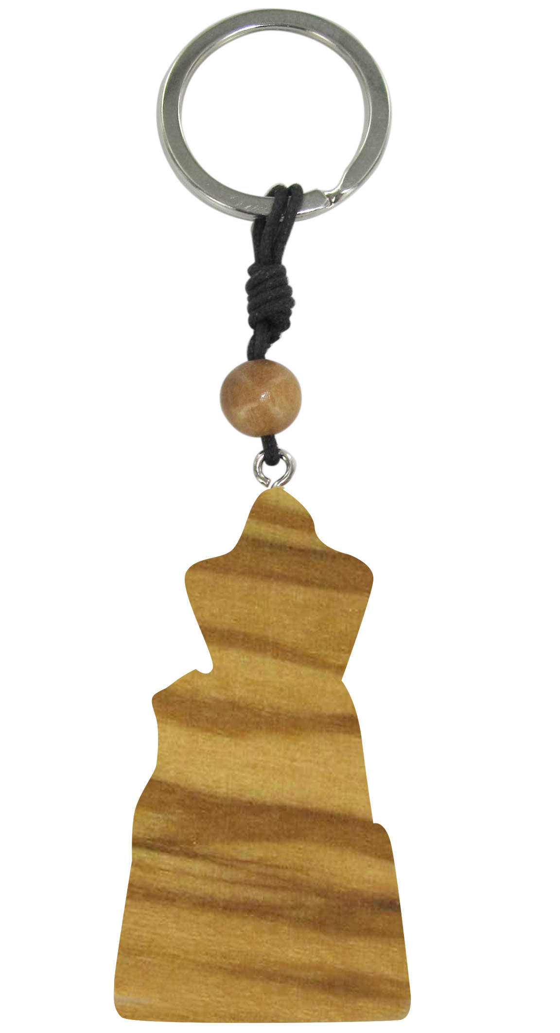 Portachiavi sagomato in legno d'ulivo con grano e con l'immagine serigrafata della Madonna di Loreto.