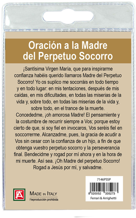 Il Portachiavi è confezionato in un blister con all'interno un immagine della Madonna di Perpetuo Soccorso sul cui retro e' stampata una preghiera in spagnolo.