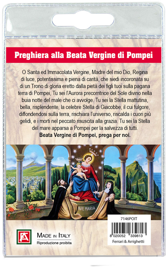 Il Portachiavi è confezionato in un blister con all'interno un immagine di Santuario Madonna di Pompei sul cui retro è stampata una preghiera a lei dedicata.