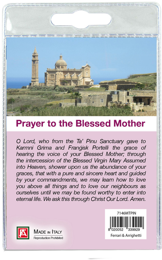Il Portachiavi è confezionato in un blister con all'interno un immagine della Madonna sul cui retro è stampata una preghiera in inglese.
