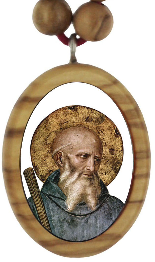 Portachiavi con decina e medaglia in ulivo raffigurante San Benedetto.