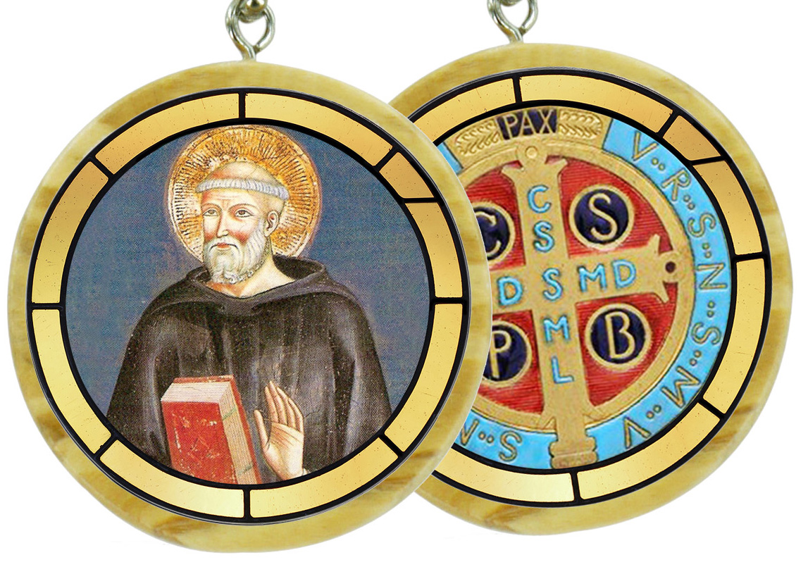 Il Portachiavi è costituito da un medaglione tondo in ulivo con da un lato l'immagine serigrafata di san Benedetto e sul retro la croce.