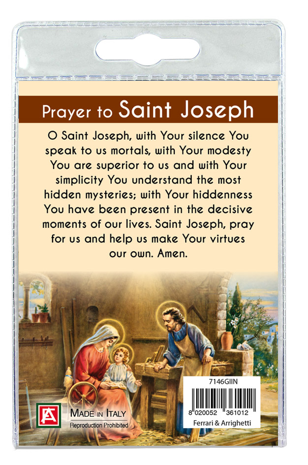 Il Portachiavi è confezionato in un blister con all'interno un immagine di San Giuseppe sul cui retro è stampata una preghiera a lui dedicata *(in inglese).