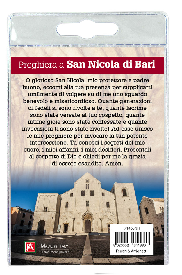 Il Portachiavi è confezionato in un blister con all'interno un immagine del Santo sul cui retro e' stampata una preghiera.