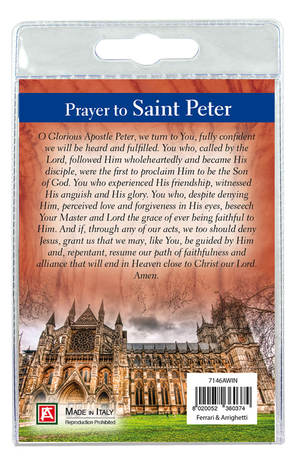 Il Portachiavi è confezionato in un blister con all'interno l'immagine di un particolare dell'Abbazia sul cui retro è stampata una preghiera dedicata a San Pietro.