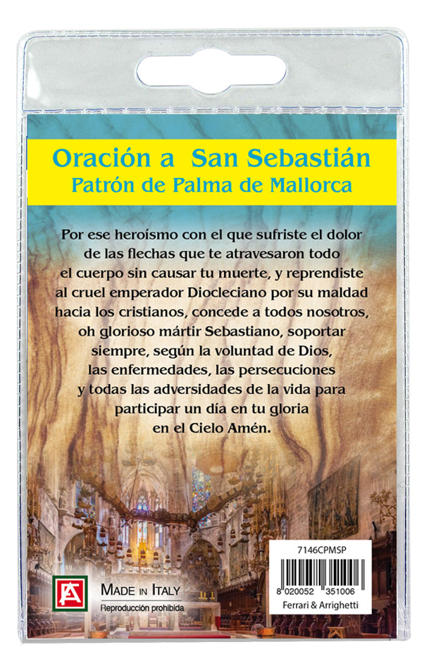 Portachiavi San Sebastiano (Cattedrale Palma di Maiorca) con decina in ulivo e preghiera in spagnolo