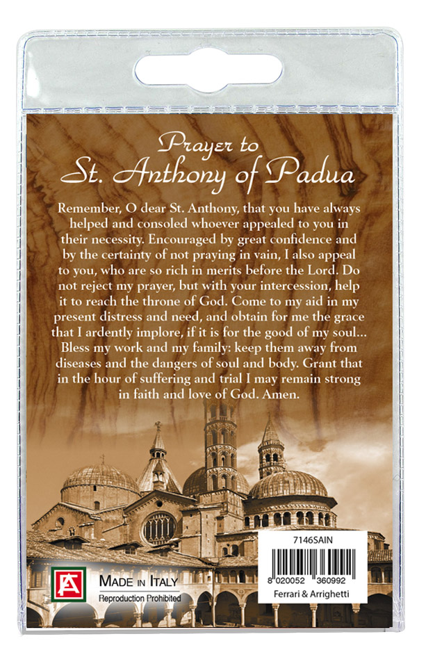 Il Portachiavi è confezionato in un blister con all'interno un immagine di Sant Antonio sul cui retro è stampata una preghiera in inglese.