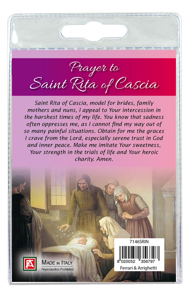 Il portachiave è confezionato in un blister con all'interno un immagine di Santa Rita sul cui retro è stampata una preghiera.