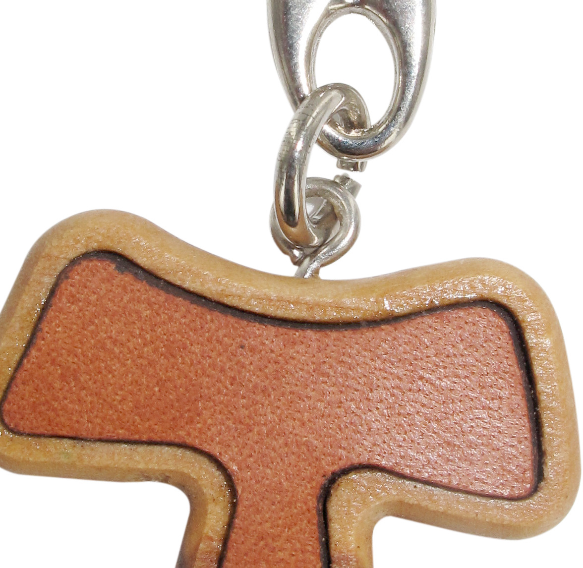 Portachiavi Tau di San Francesco d'Assisi in legno d'ulivo con intarsio centrale in cuoio.