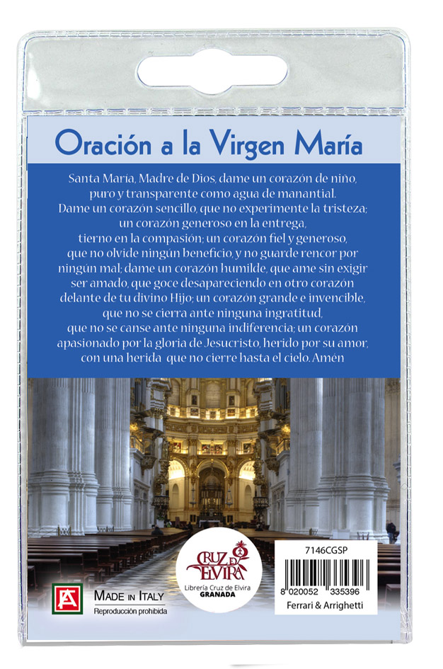 Il Portachiavi è confezionato in un blister con all'interno un immagine della Vergine della Cattedrale di Granada sul cui retro e' stampata una preghiera in spagnolo.