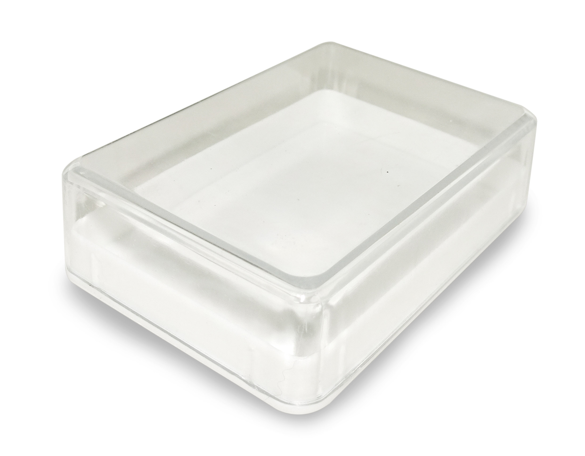 Scatolina portarosario in plastica rigida rettangolare con coperchio trasparente.