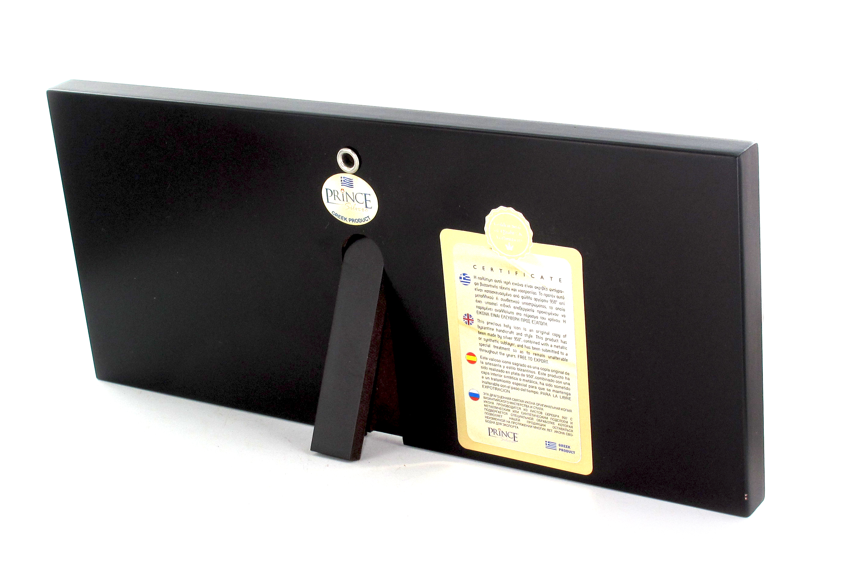 La tavola è in lastra d'argento con dettagli colorati applicata su legno scuro con piedino d'appoggio e foro sul retro.