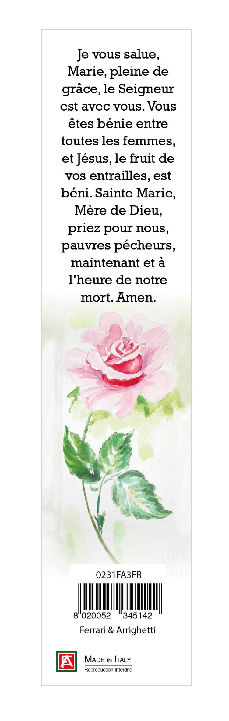 Il rosario è confezionato in un cartoncino con l'immagine della Madonna Fatima, sul retro vi è una preghiera dedicata a lei il tutto infilato in una busta trasparente.
