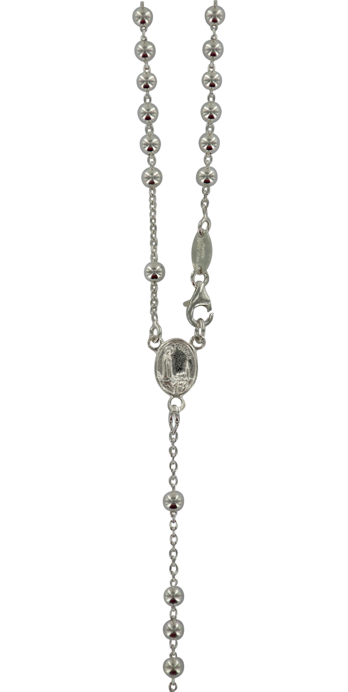 Il rosario si presenta con grani di mm 4 lucidi. La crociera ovale rappresenta la Madonna di Fatima e misura cm 1,2 mentre la croce anch'essa in argento lucido misura cm 1,5.
