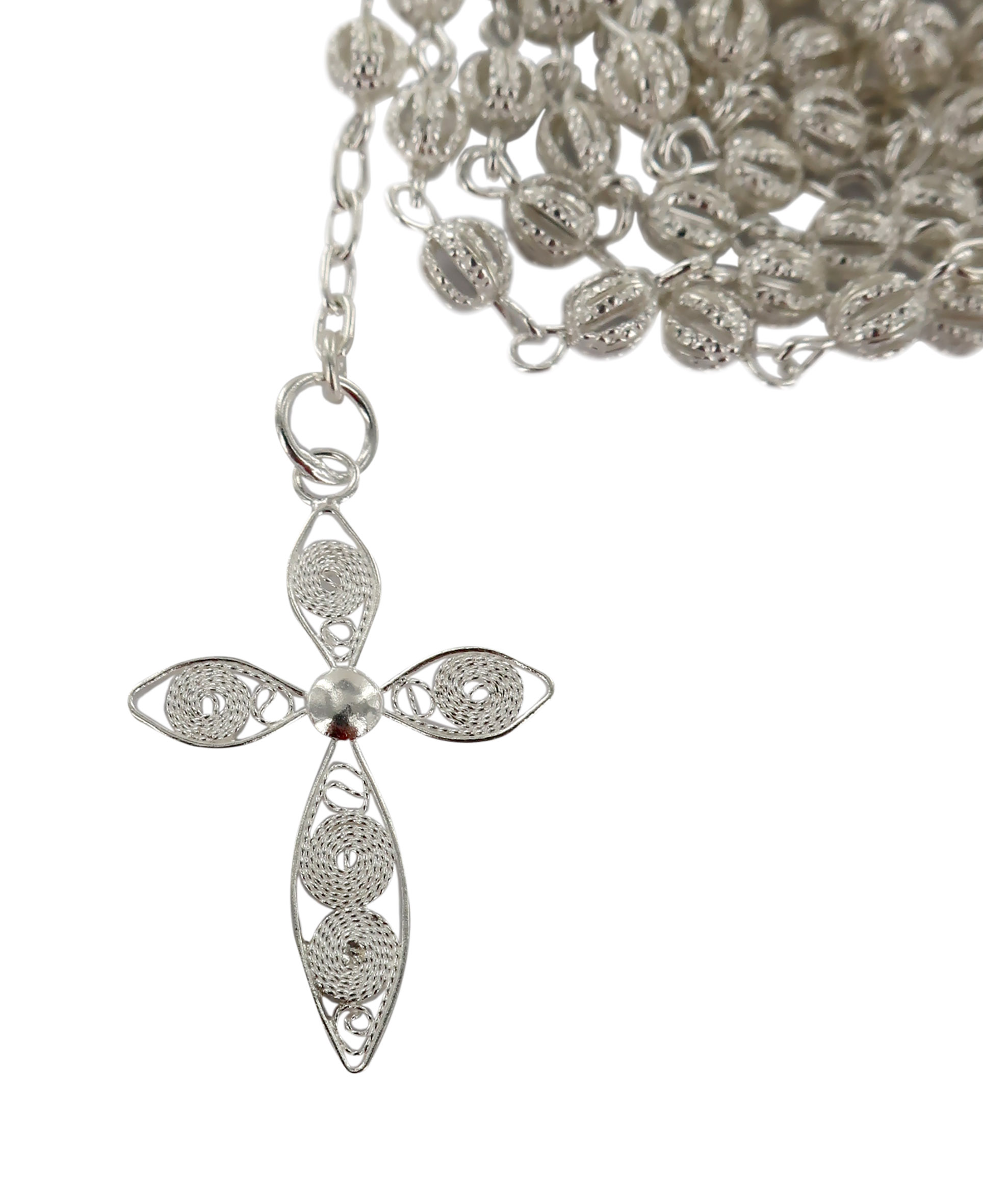 Il rosario è in preziosa filigrana, rilegato a mano e con croce e crociera anch'esse in filigrana.