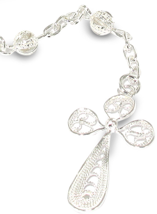 Il rosario è in preziosa filigrana, rilegato a mano e con croce e crociera anch'esse in filigrana.
