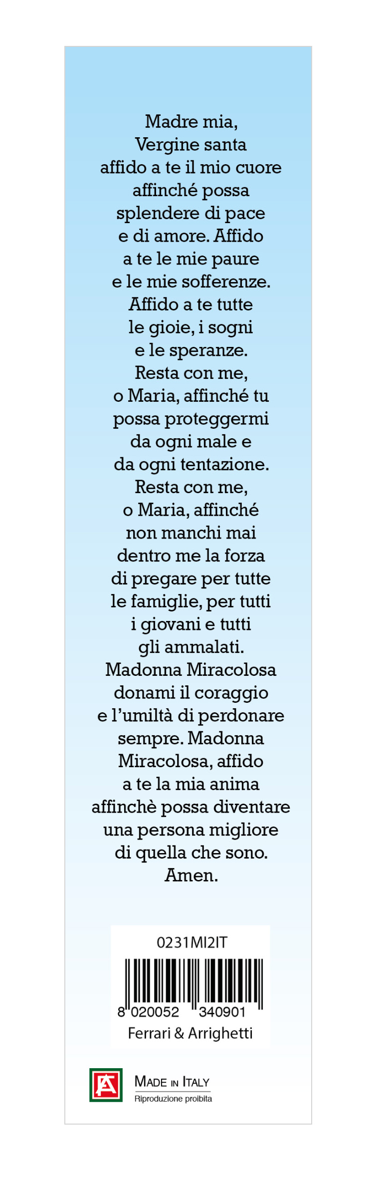 Il rosario è confezionato in un cartoncino con l'immagine della Madonna Miracolosa, sul retro vi è una preghiera dedicata a lei il tutto infilato in una busta trasparente.