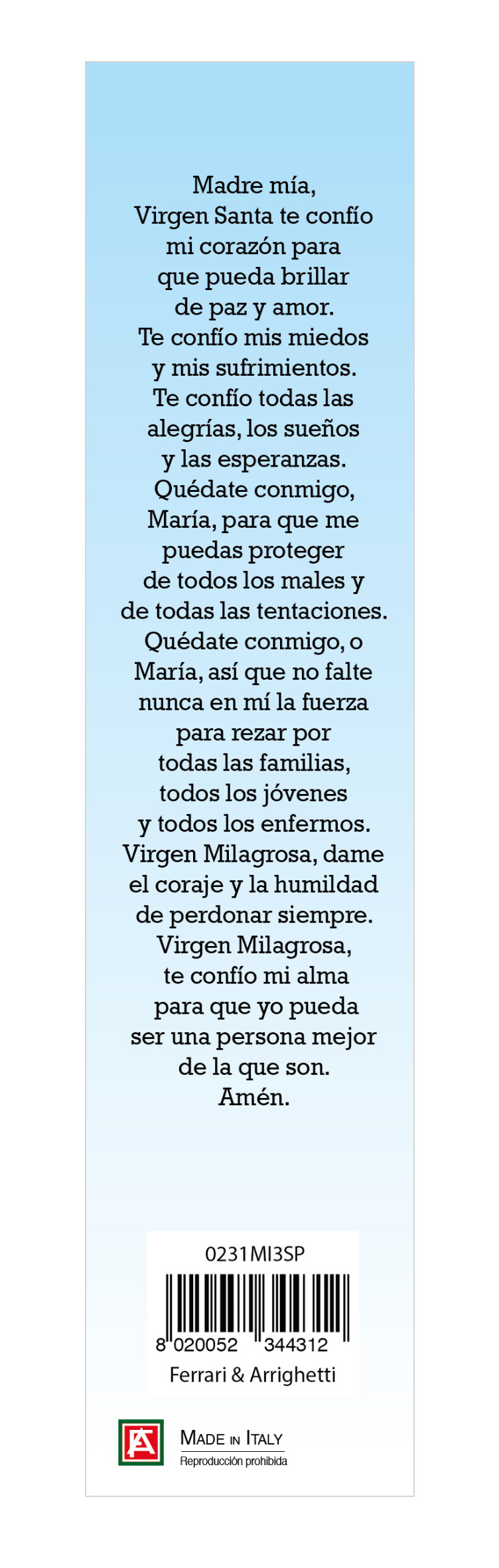 Il rosario è confezionato in un cartoncino con l'immagine della Madonna Miracolosa, sul retro vi è una preghiera dedicata a lei scritta in spagnolo (il tutto infilato in una busta trasparente).