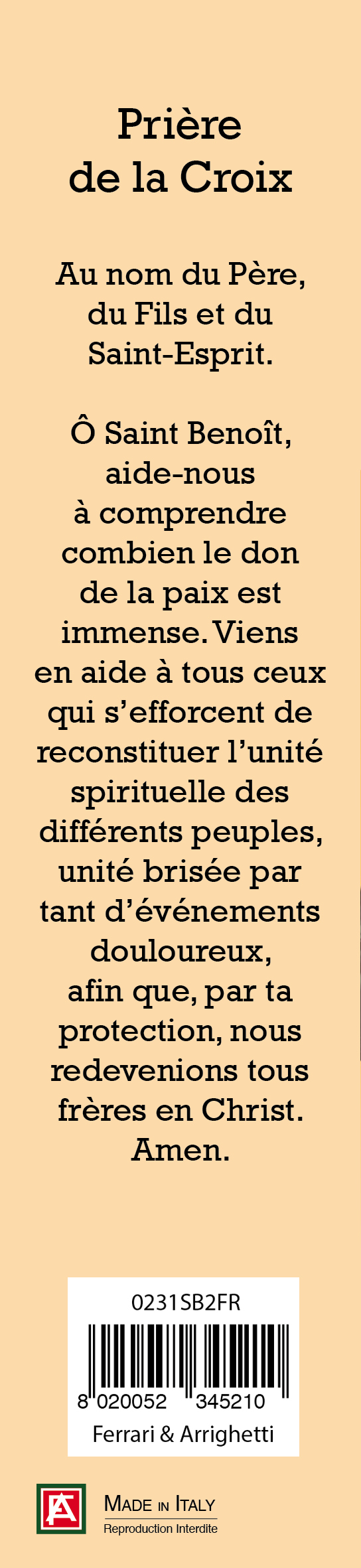 Il rosario si presenta con grani di mm 2,5 lucidi. La crociera ovale rappresenta San Benedetto e misura cm 1,2 mentre la croce anch'essa in argento lucido misura cm 1,5.