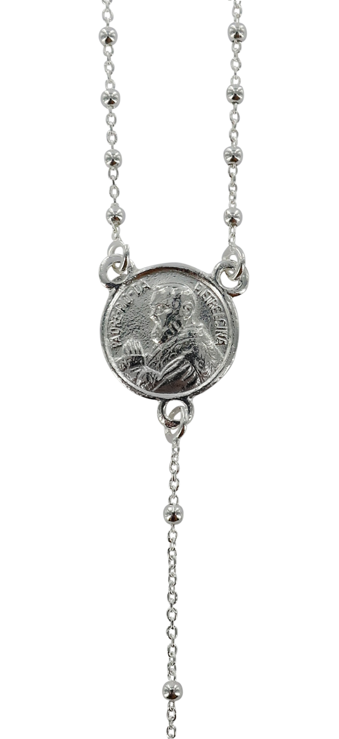 Rosario San Pio in argento 925 con grani tondi da Ø 1,5 mm su catena con moschettone