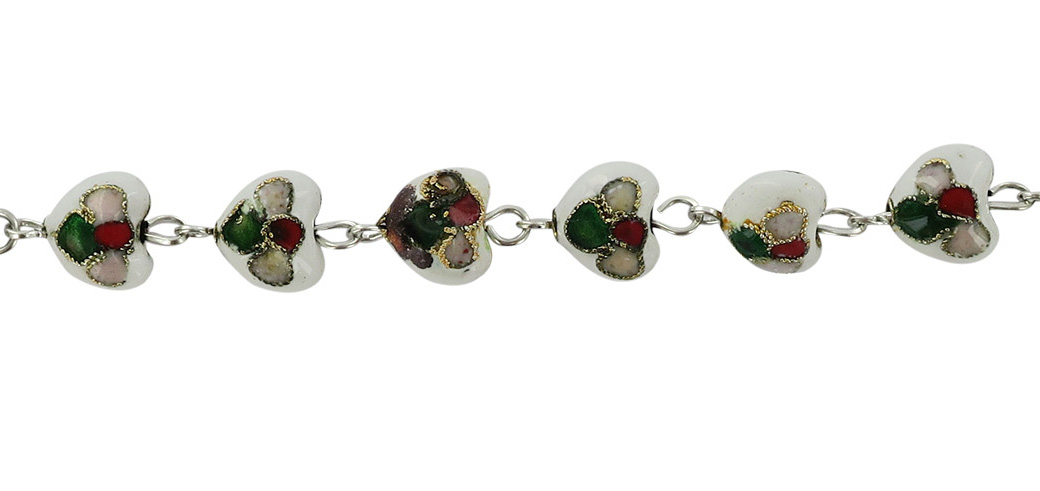Bracciale Rosario cloisonnè con 11 grani a forma di cuore e la croce di altezza 2 cm con base di colore bianco e legatura in metallo.