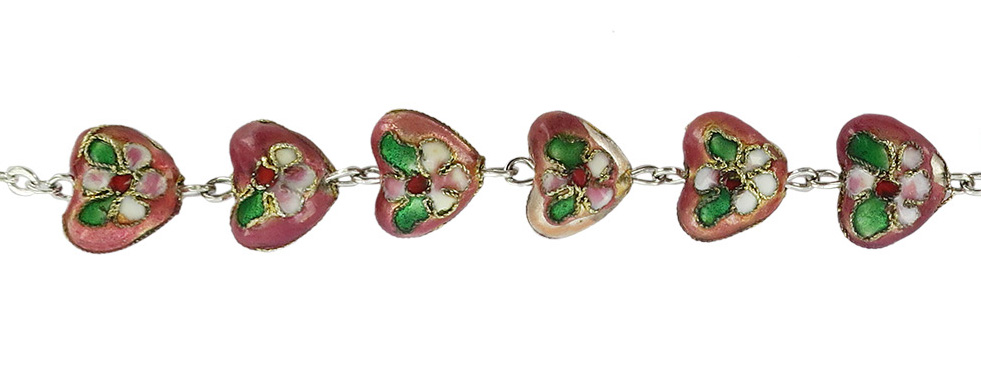 Braccialetto cloisonnè con 11 grani a forma di cuore e la croce di altezza 2 cm con base di colore rosa e legatura in metallo.