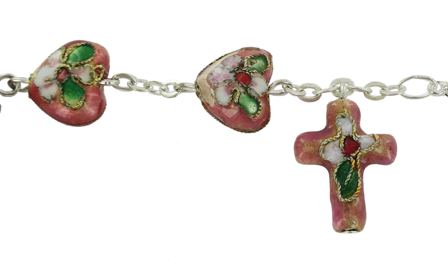 Braccialetto cloisonnè con 11 grani a cuore e croce - rosa