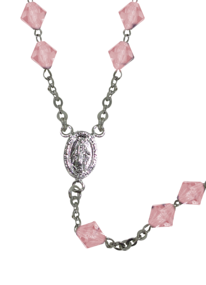 Prezioso rosario in cristallo rosa con legatura a mano in argento 925 disponibile con grani di diametro 7 mm. Il grano è pieno, brillante e luminoso. La legatura è particolarmente robusta: detta eterna, è una legatura speciale, rigorosamente fatta a mano in Italia, in cui i grani sono incatenati tra loro con un anello chiuso che li unisce saldamente tra di loro. Prodotto completamente a mano da artigiani italiani, consegnato in elegante scatola porta rosario.