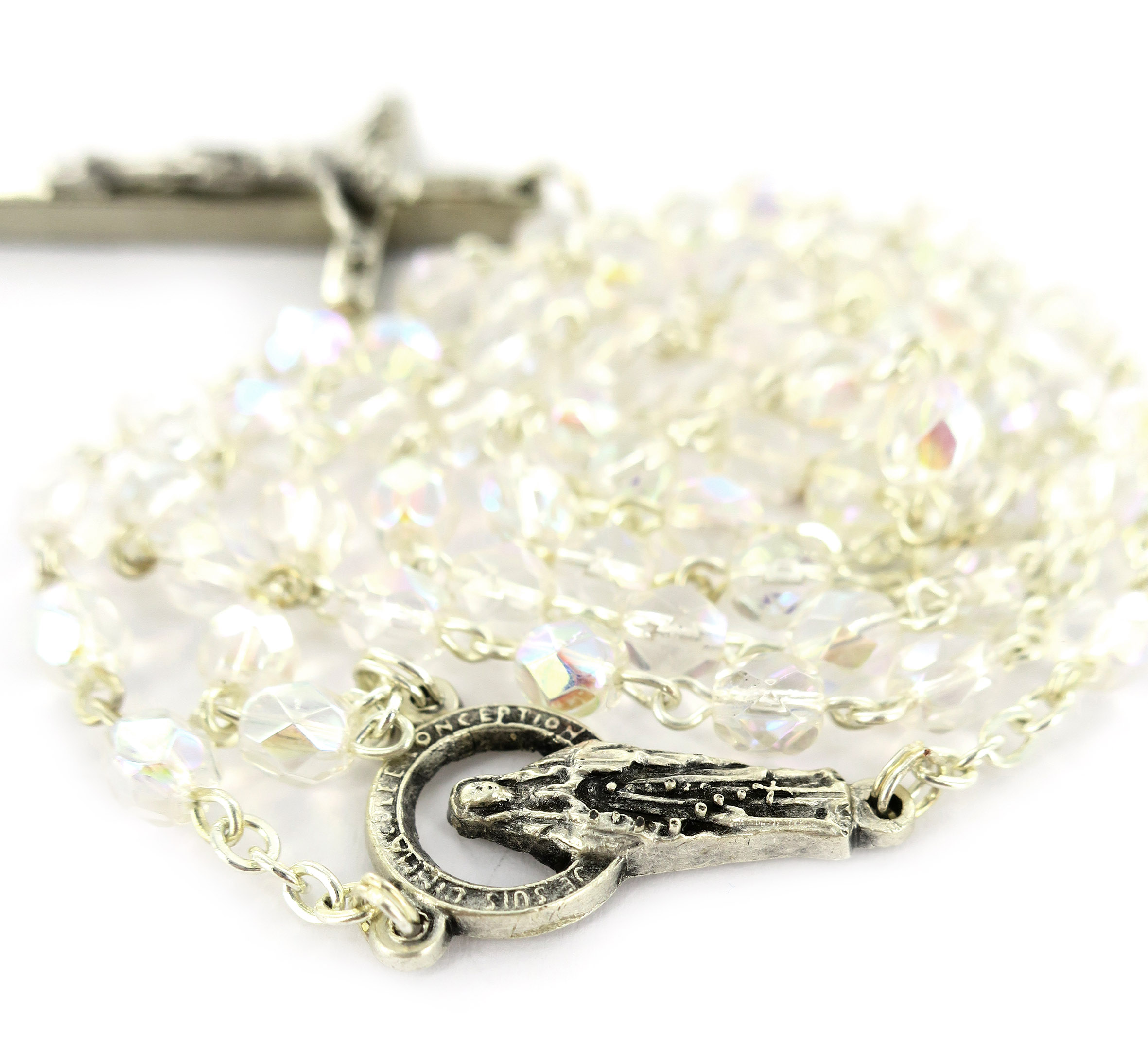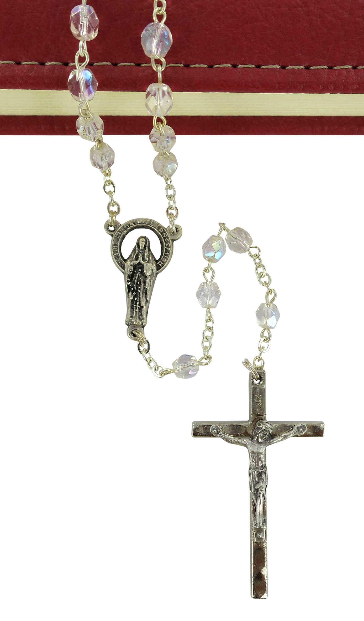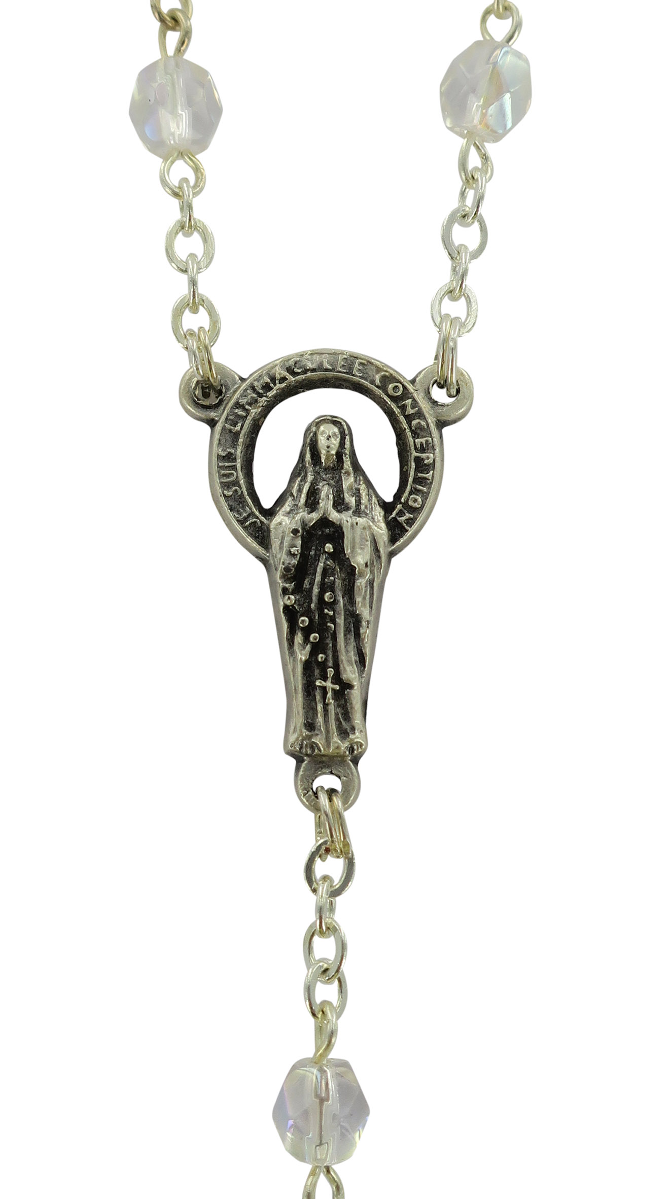 Rosario in semicristallo con grani di diametro 5 mm. Colore: bianco.