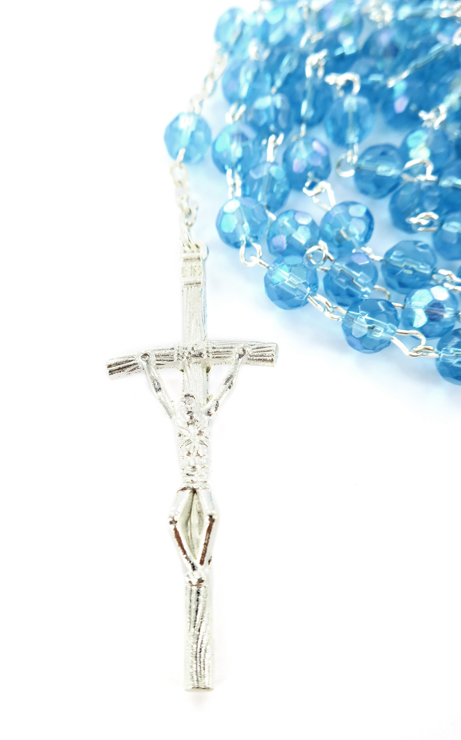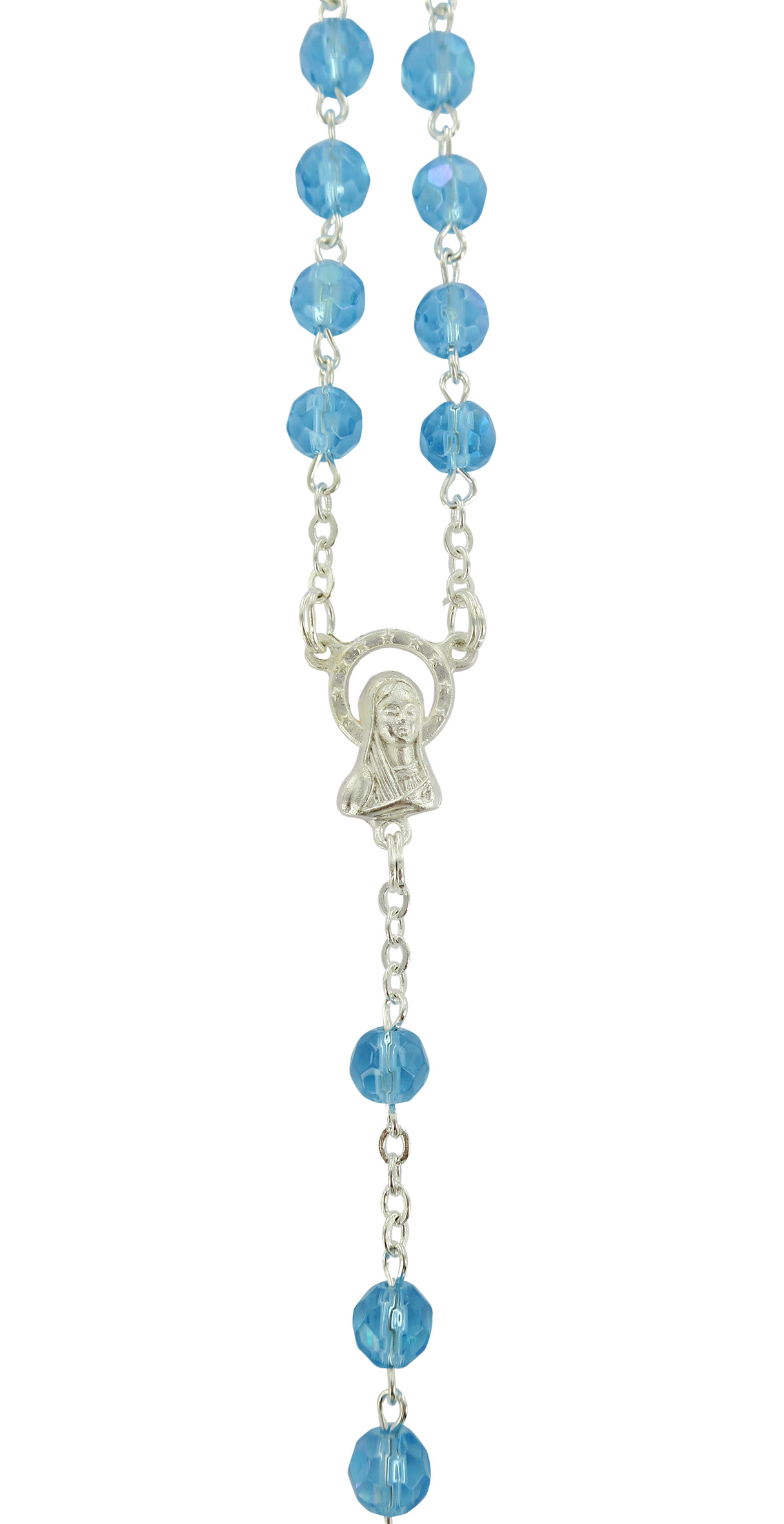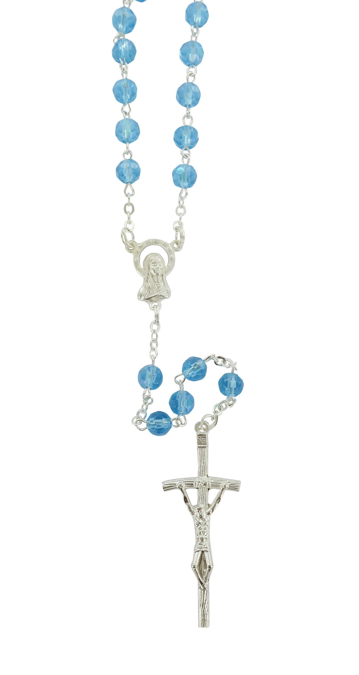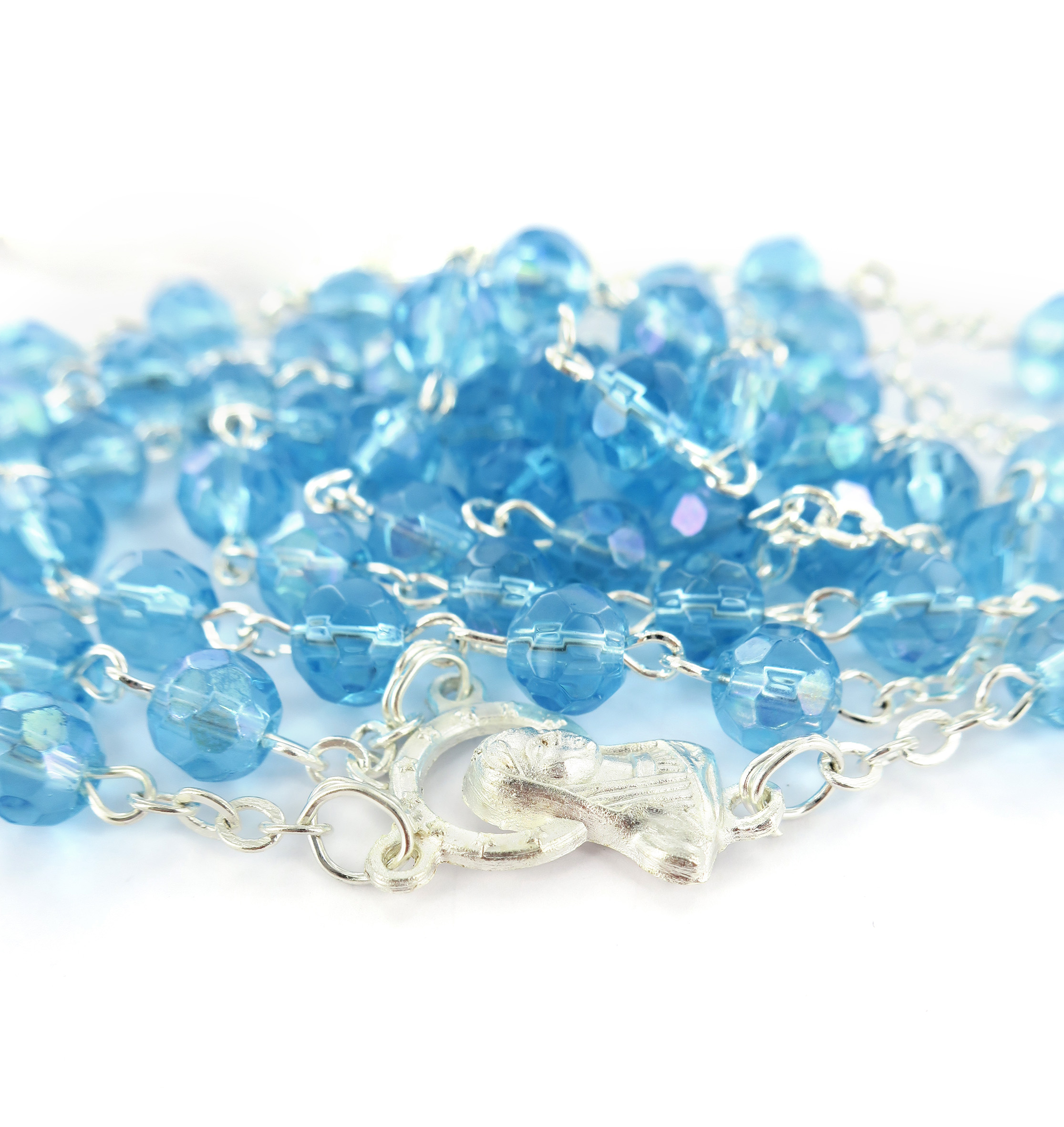 Rosario con grani in semicristallo di colore dell'acqua marina la cui misura è 6 millimetri.