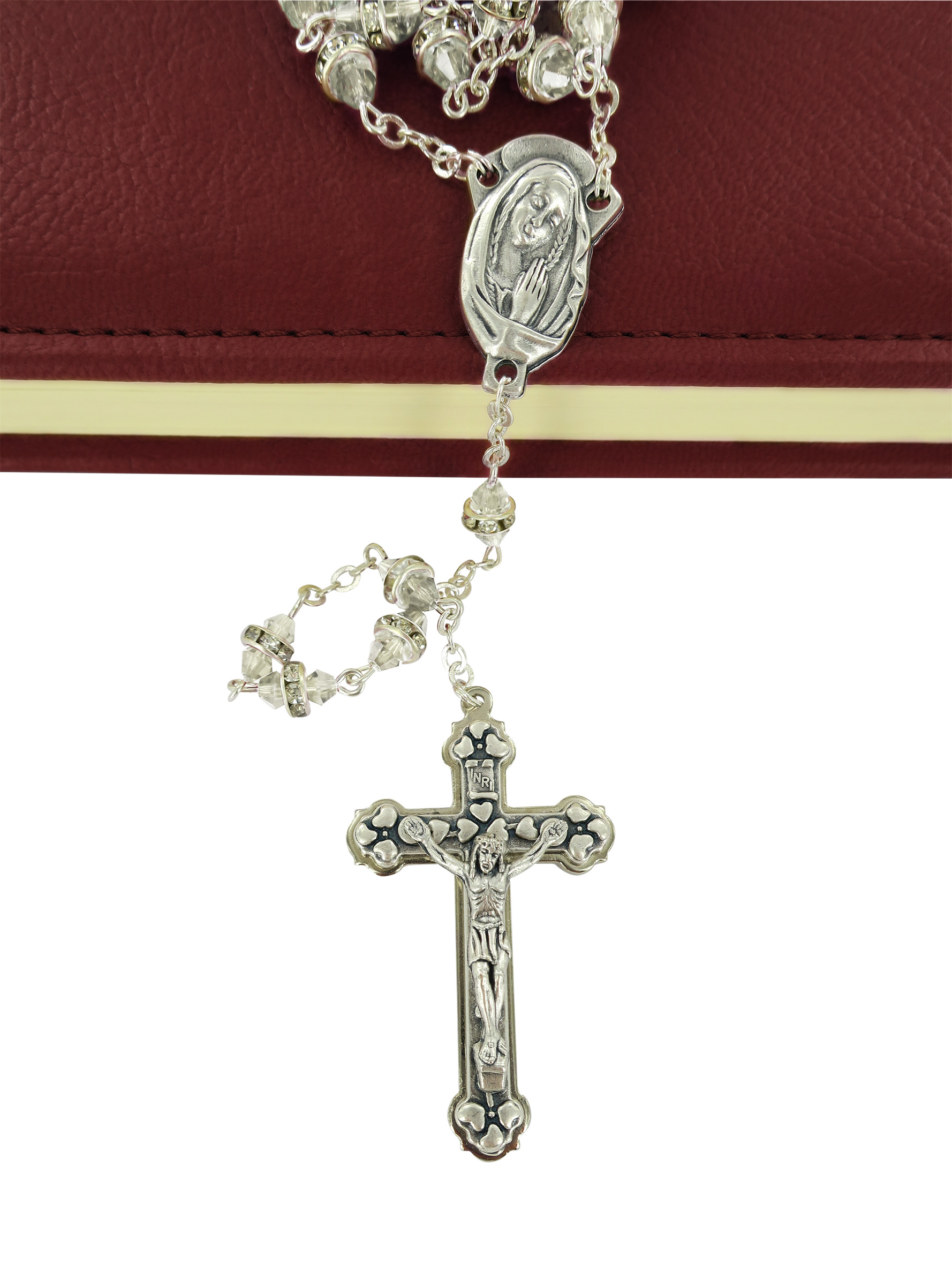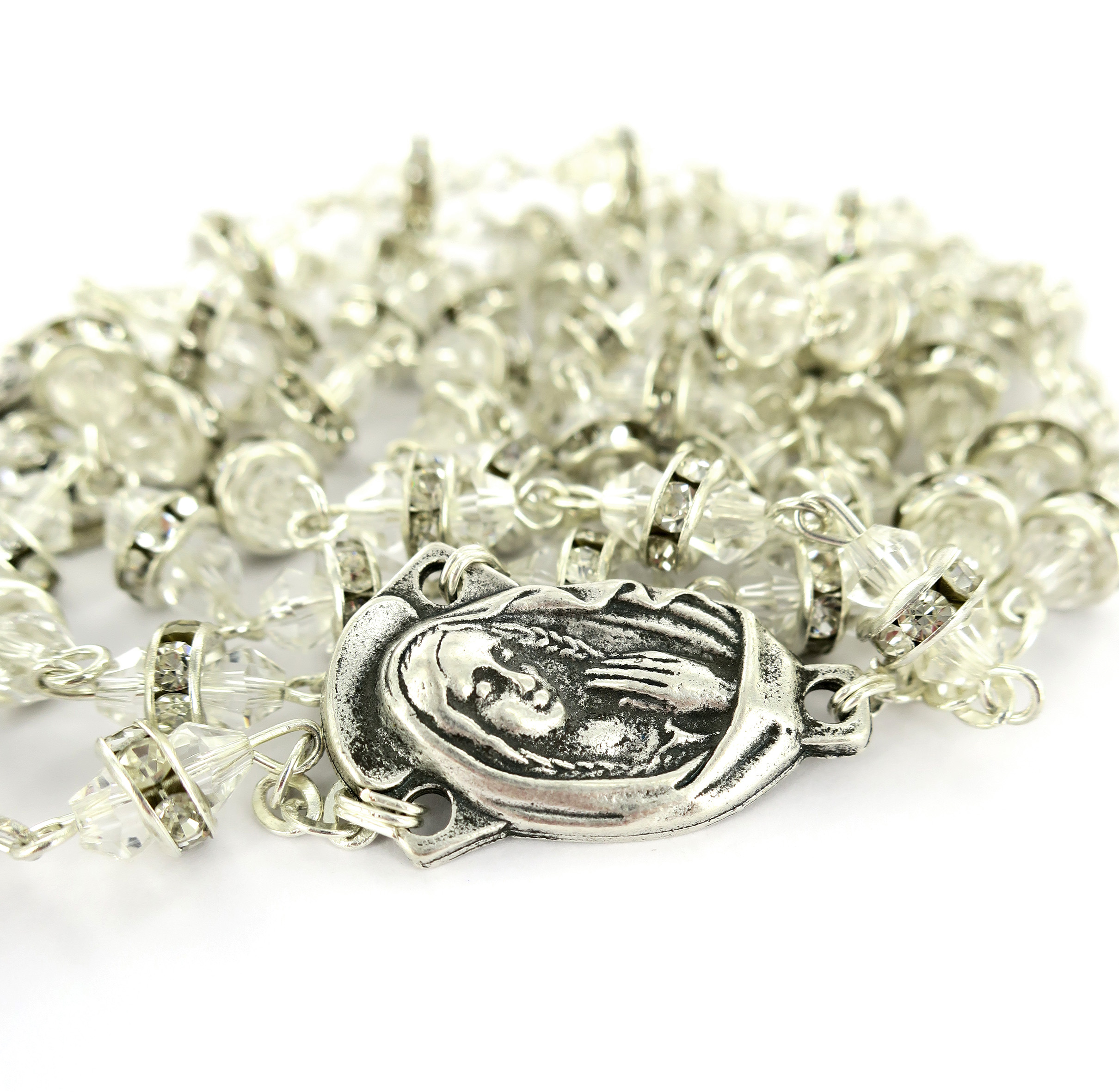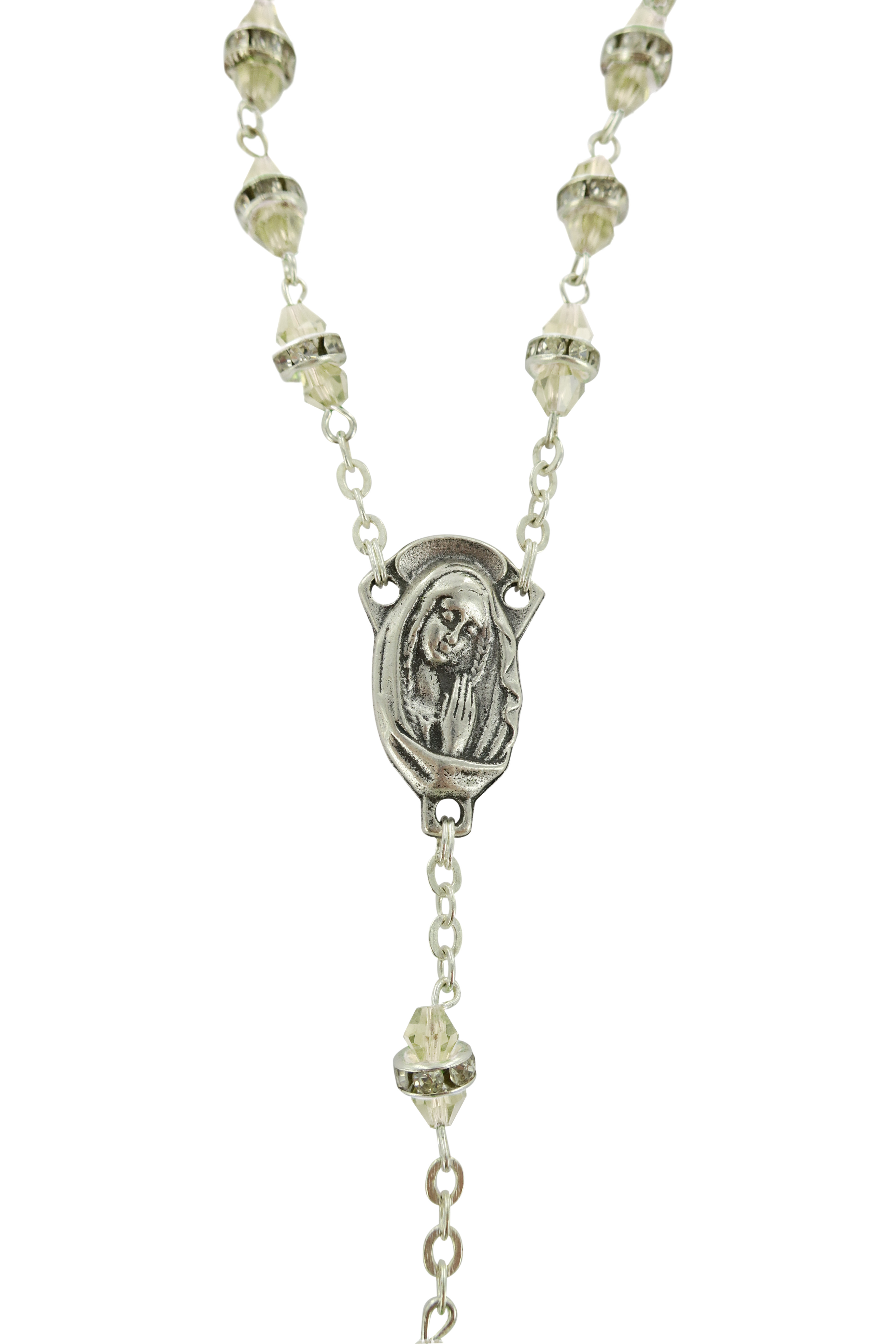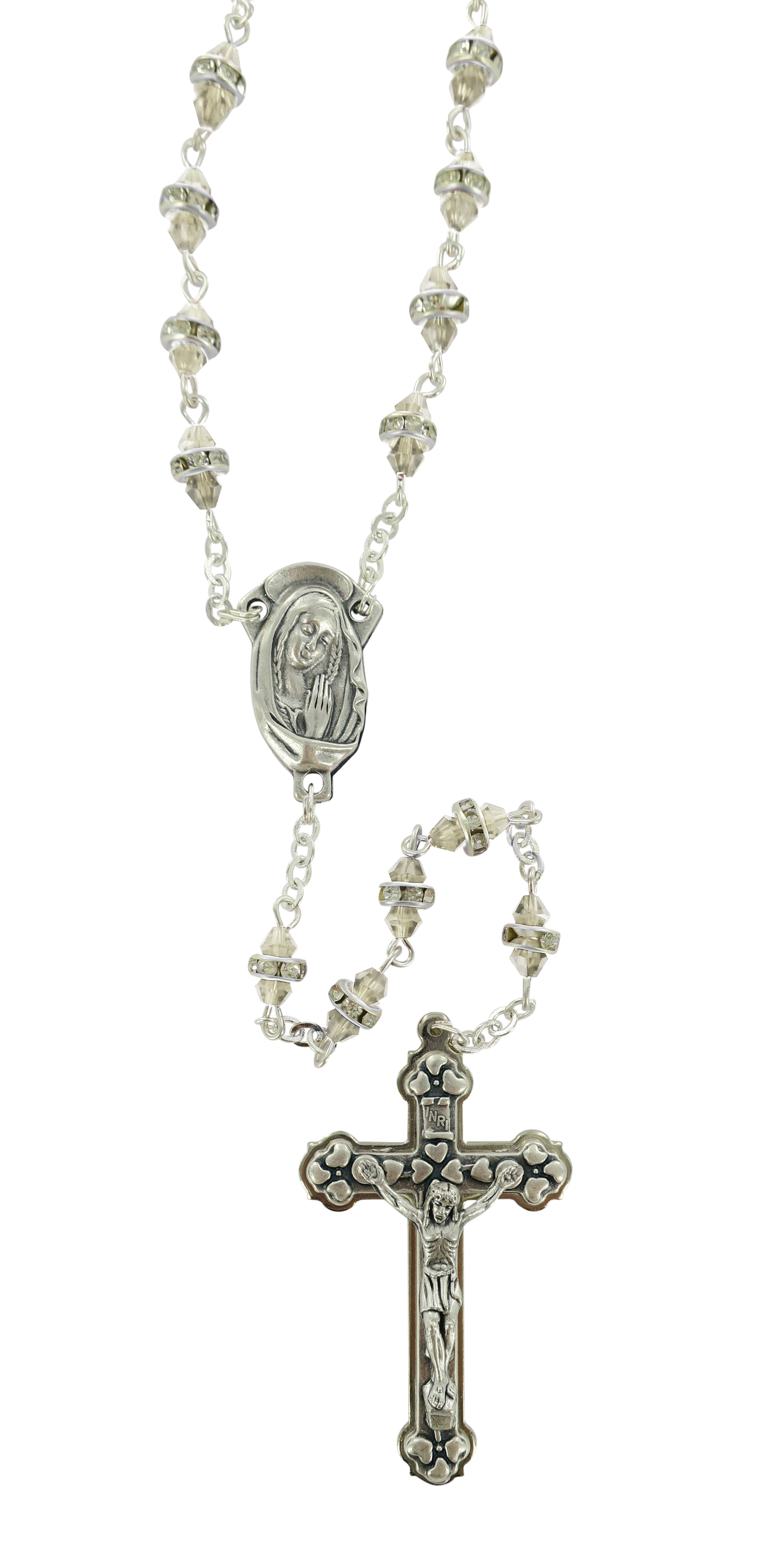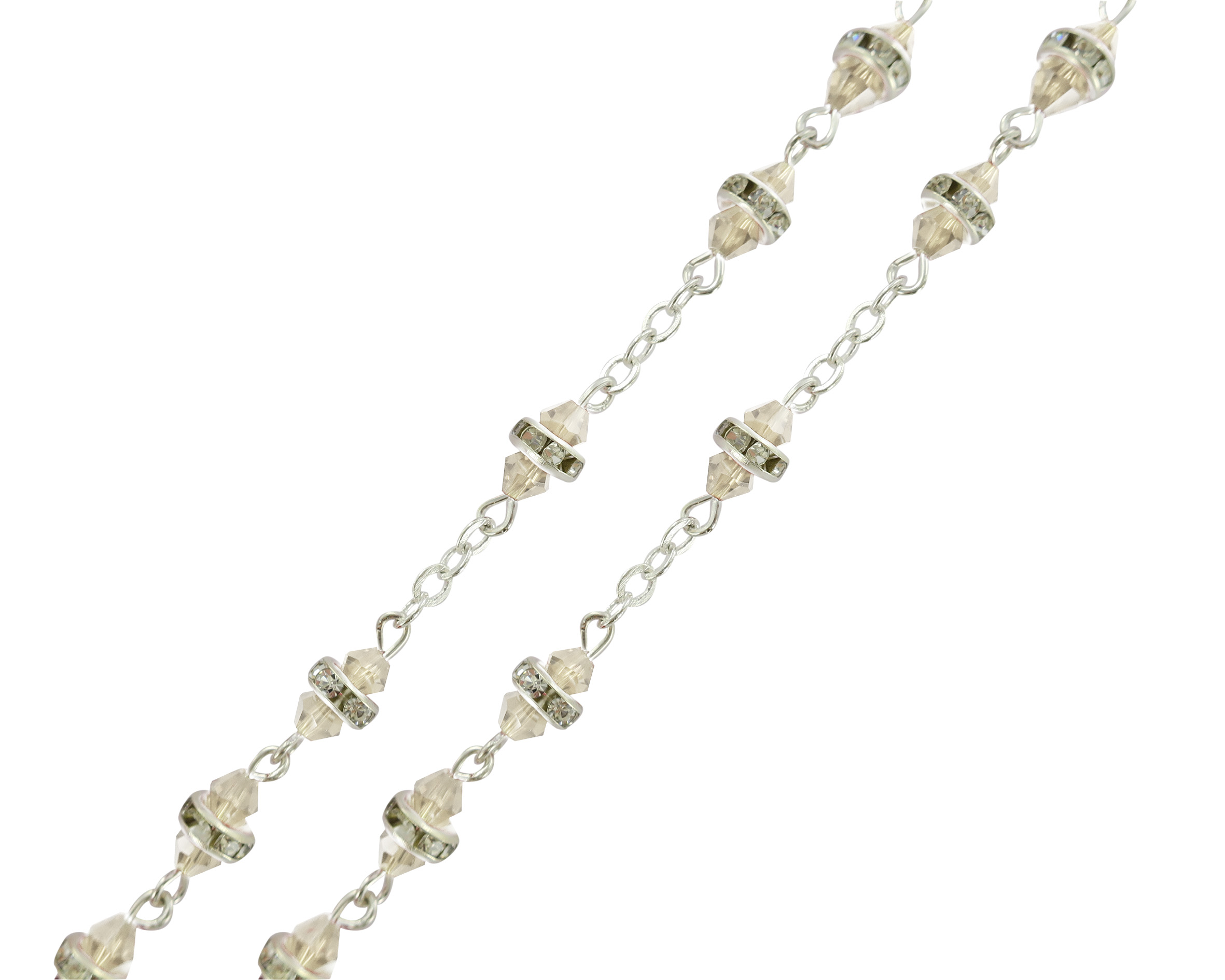 La luminosità di questo rosario,rilegato a mano in metallo argentato, è dovuta ai grani in semicristallo trasparente biaco impreziositi da un piccolo anello in strass bianchi.