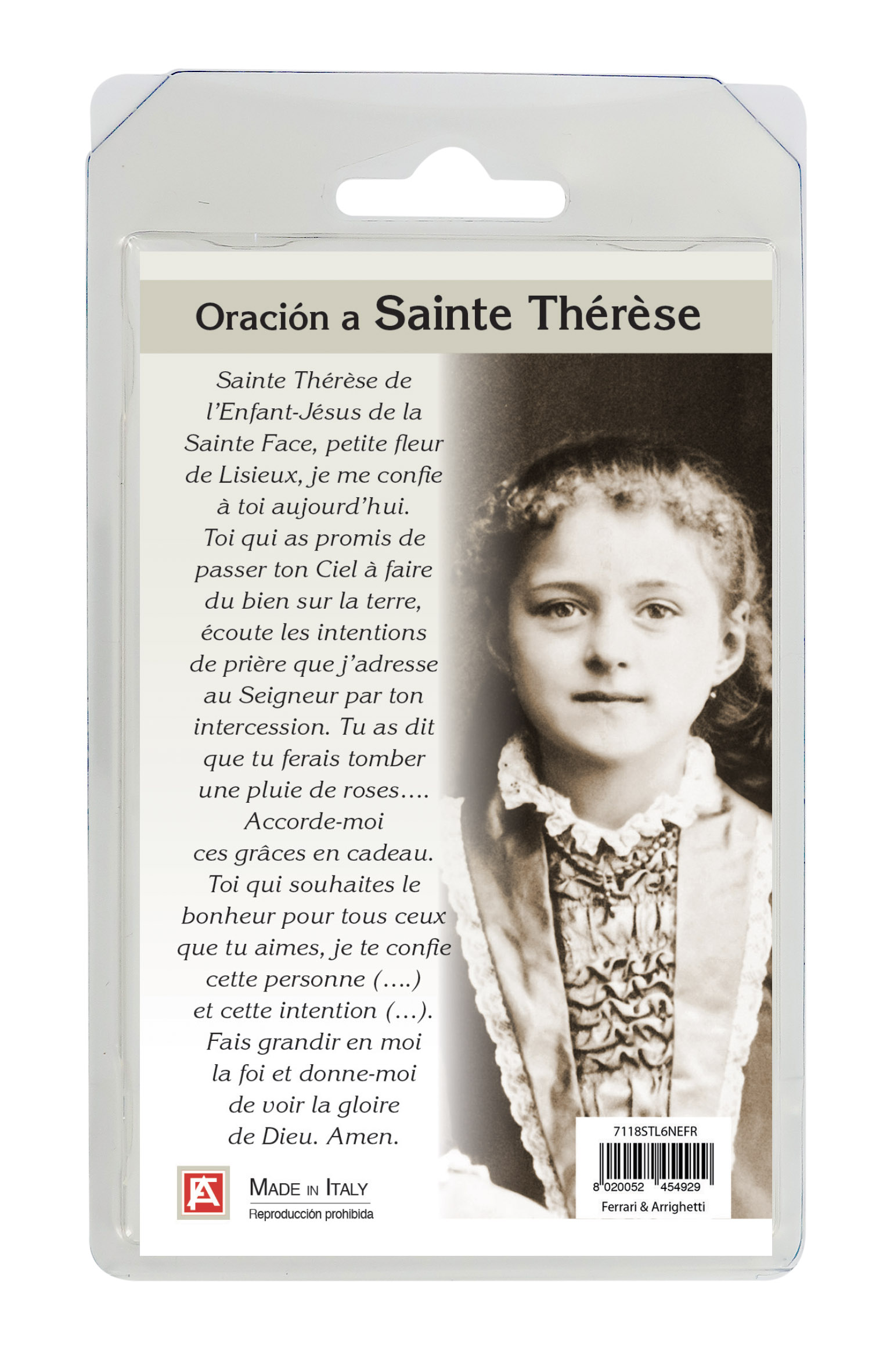 Si presenta confezionato in una scatolina in plastica rigida trasparente al cui interno troviamo un cartoncino con l'immagine di Santa Teresa di Lisieux sul cui retro è stampata una preghiera a lei dedicata.