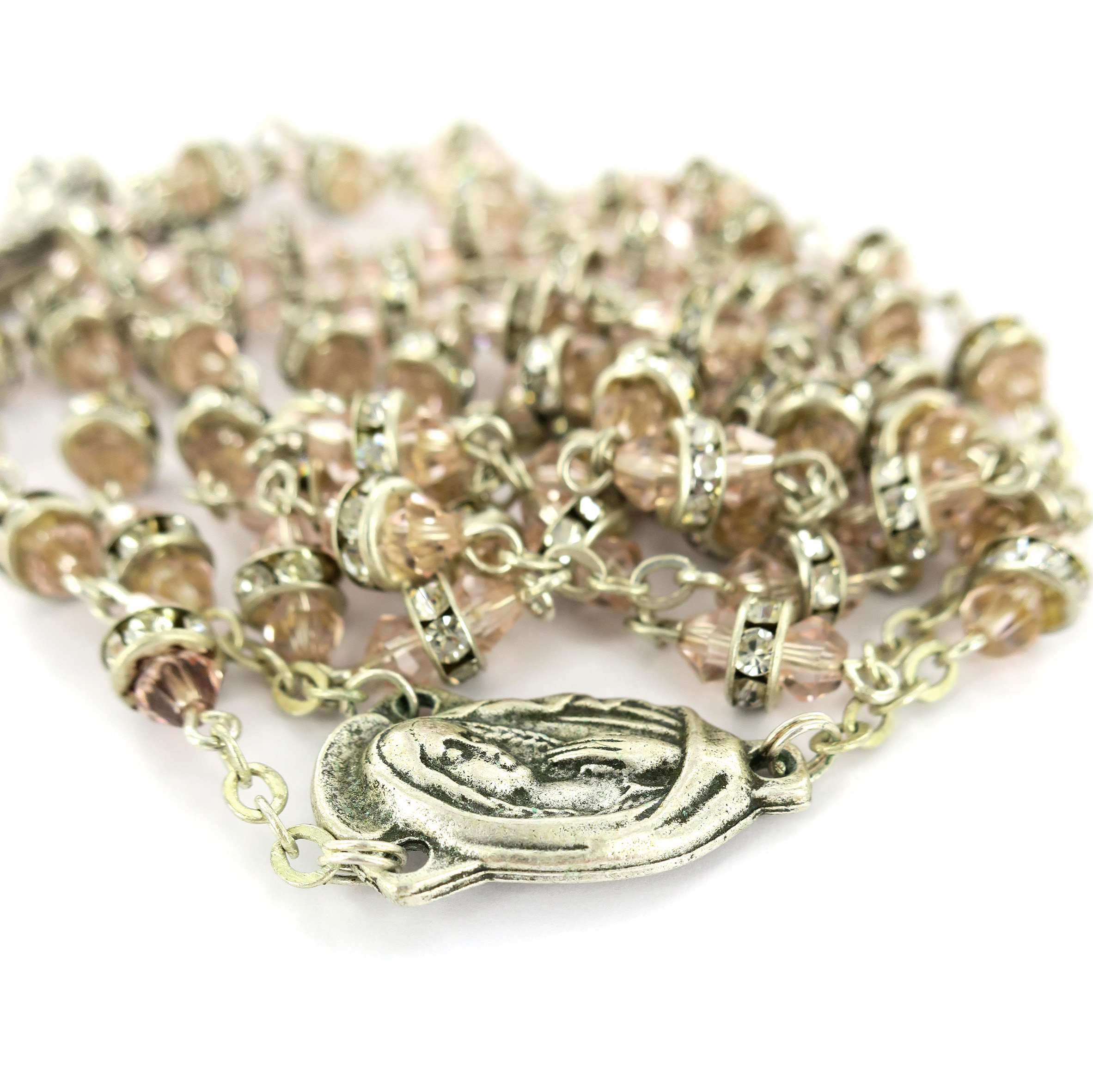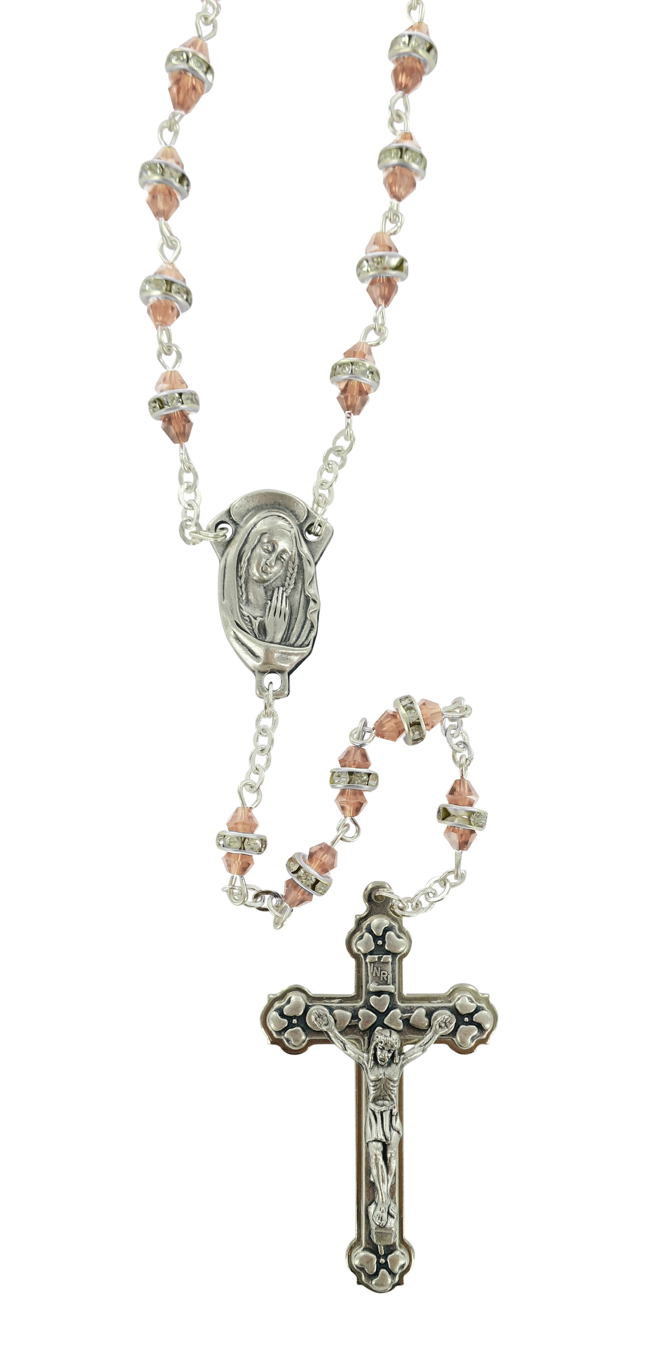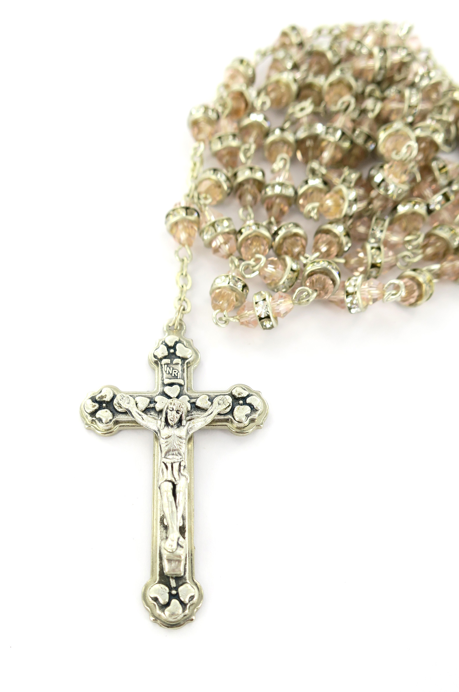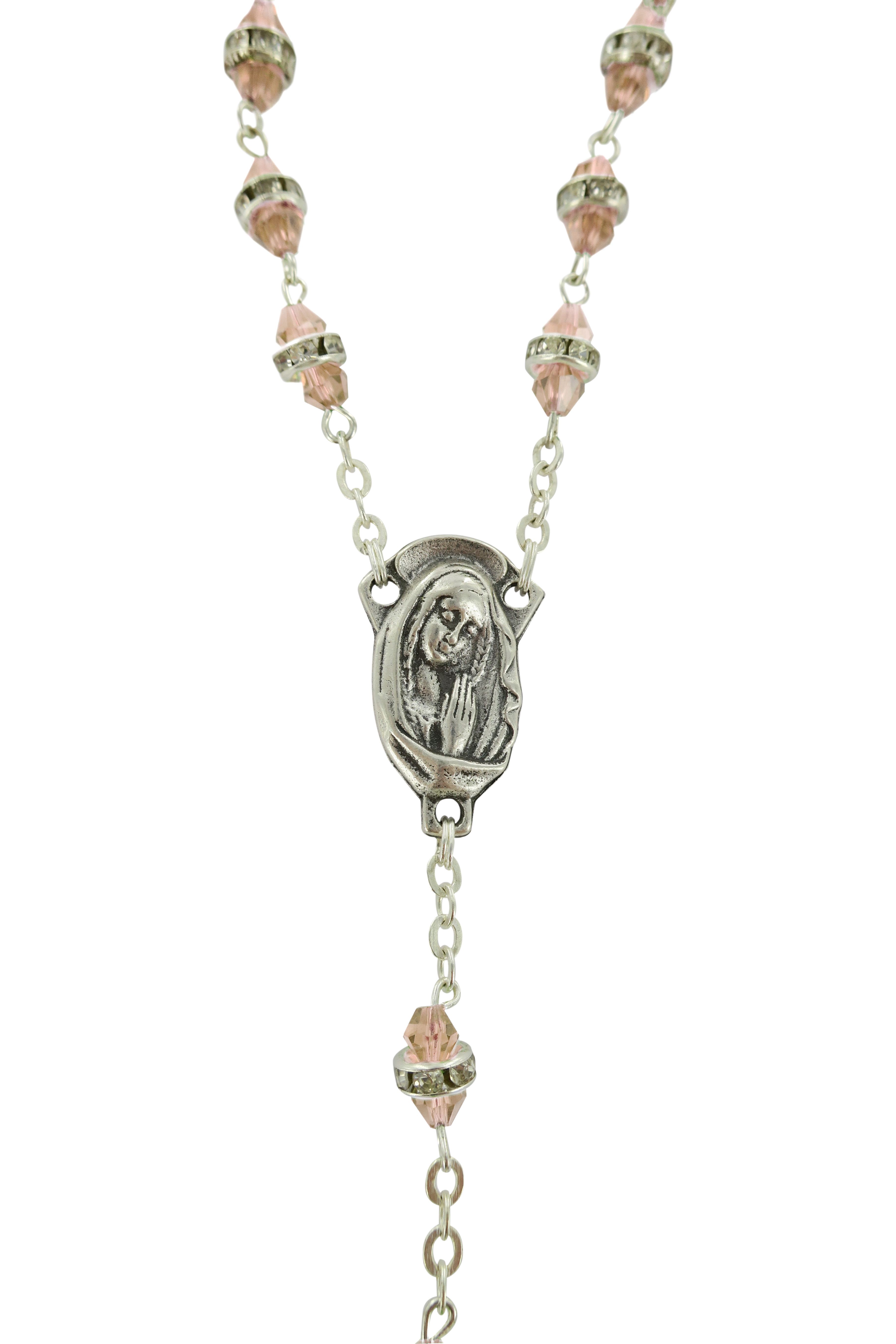 La luminosità di questo rosario,rilegato a mano in metallo argentato, è dovuta ai grani in semicristallo trasparente rosa impreziositi da un piccolo anello in strass bianchi.