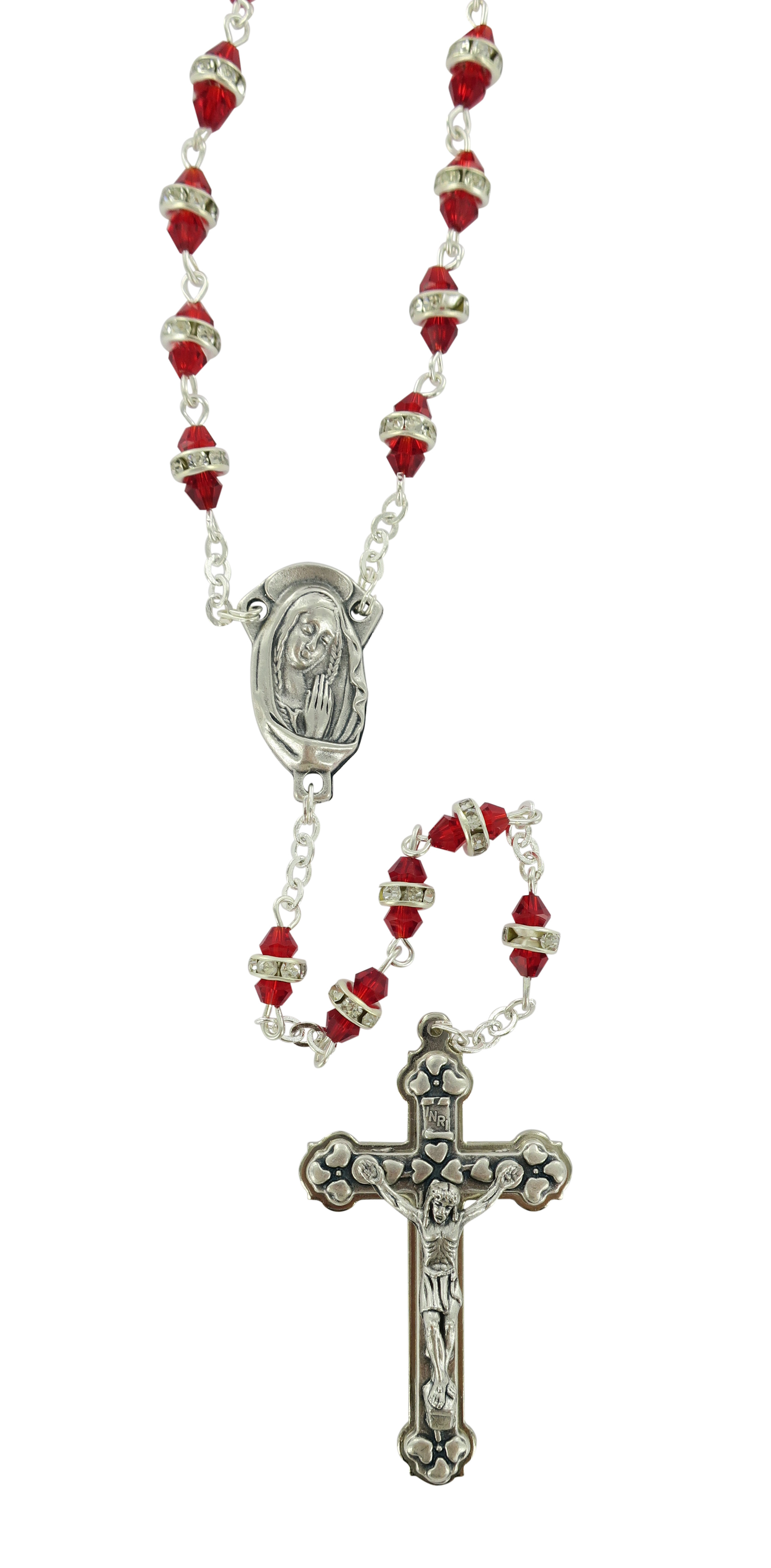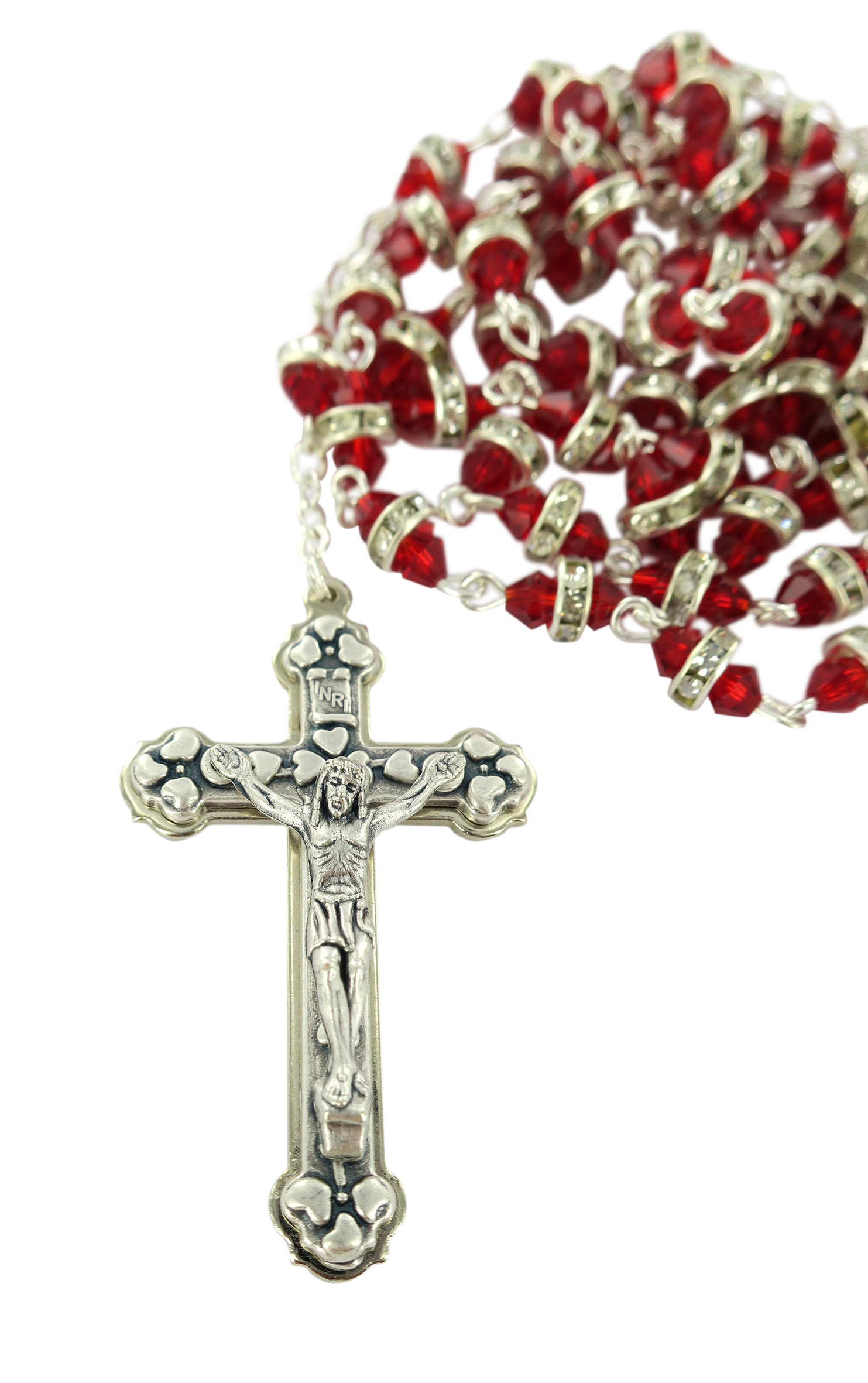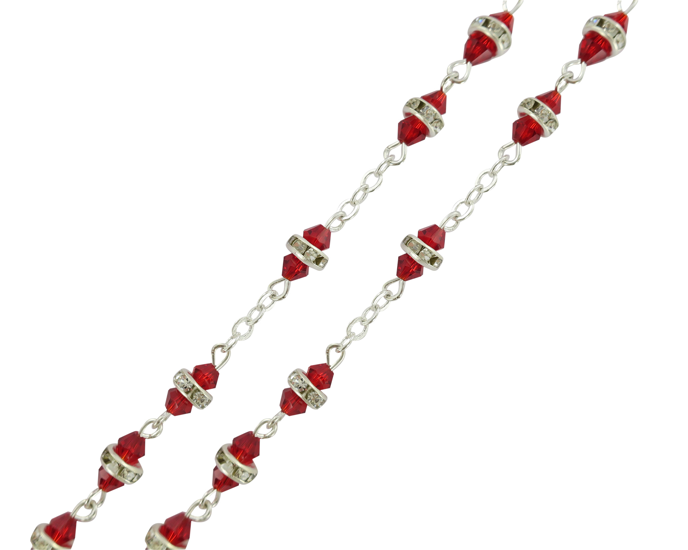 La luminosità di questo rosario,rilegato a mano in metallo argentato, è dovuta ai grani in semicristallo trasparente rosso impreziositi da un piccolo anello in strass bianchi.