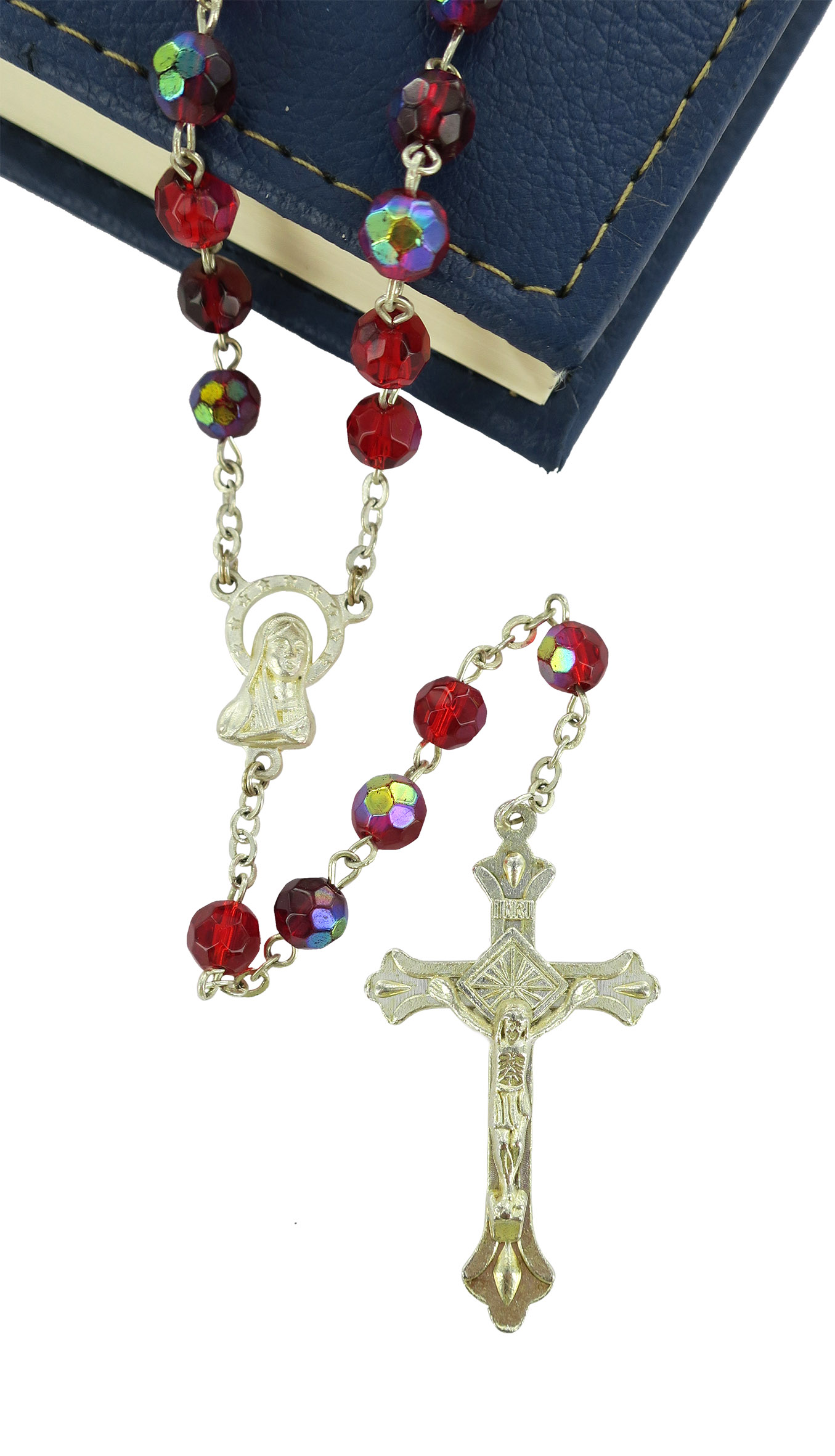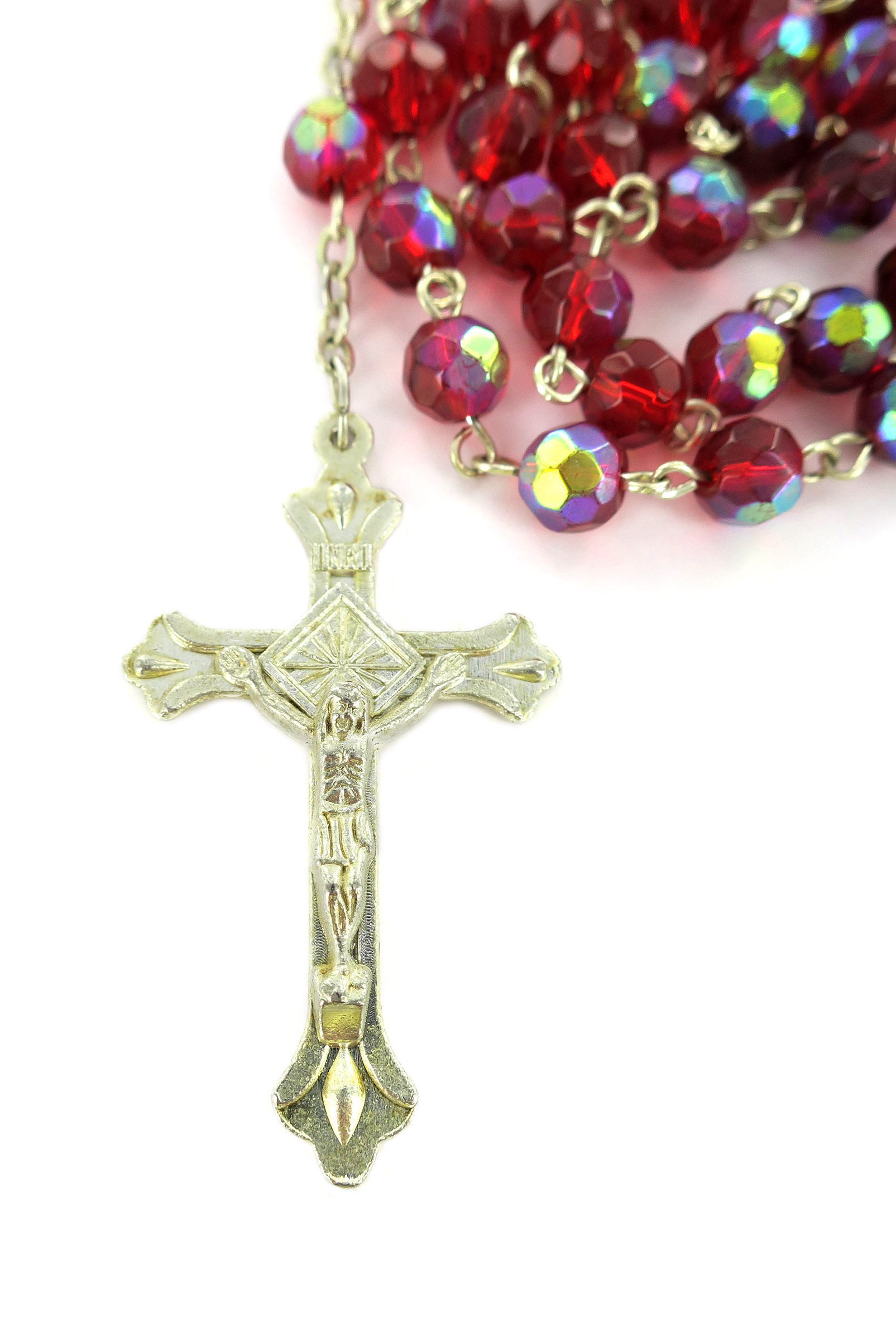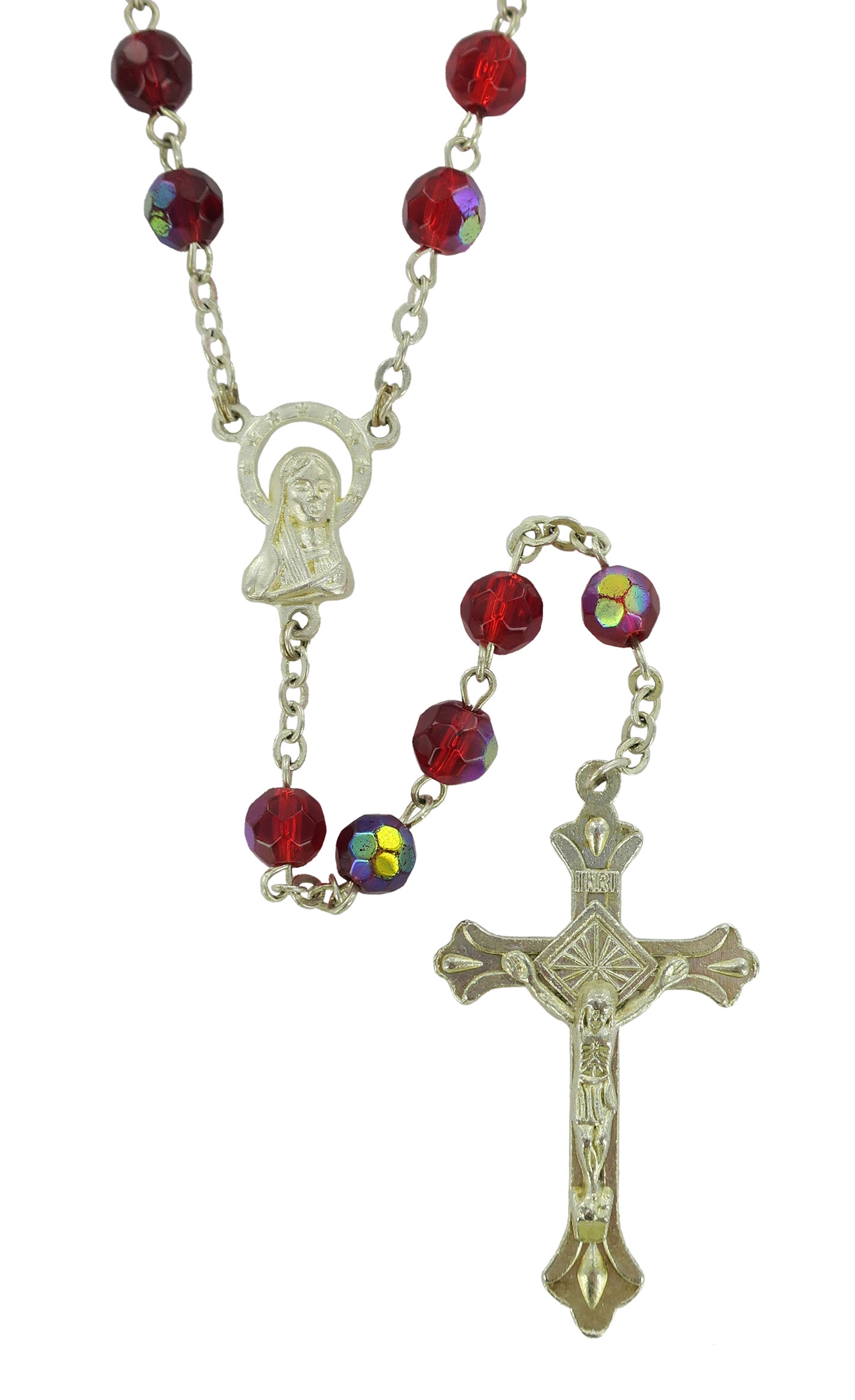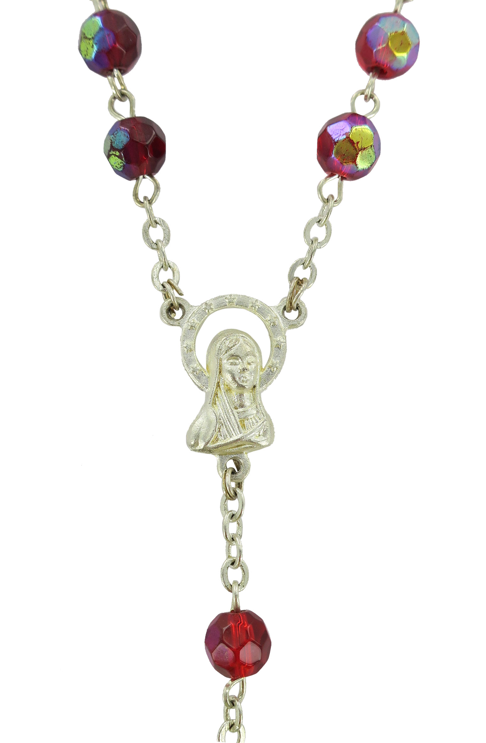 Rosario con grani in semicristallo di colore rosso la cui misura è 6 millimetri.