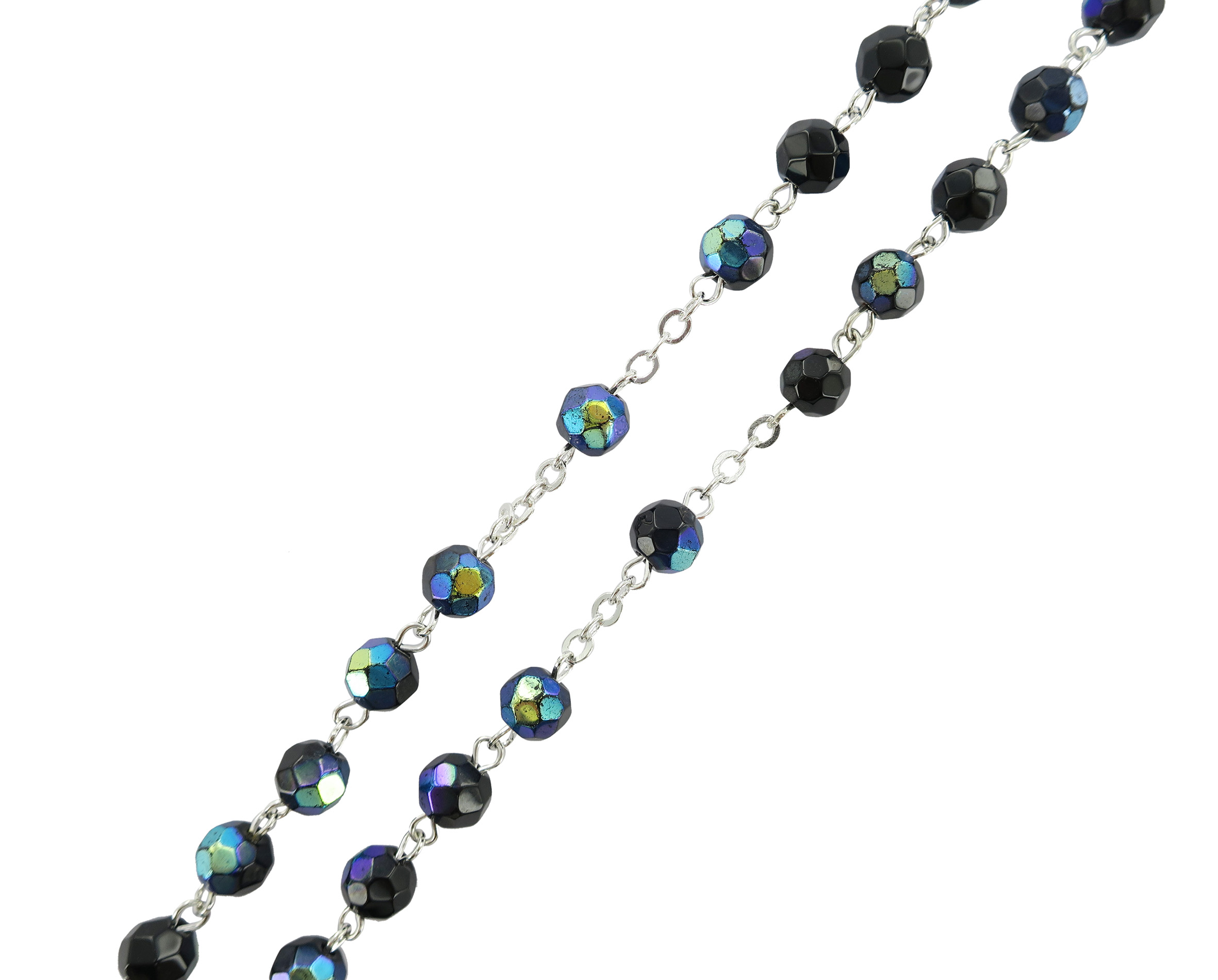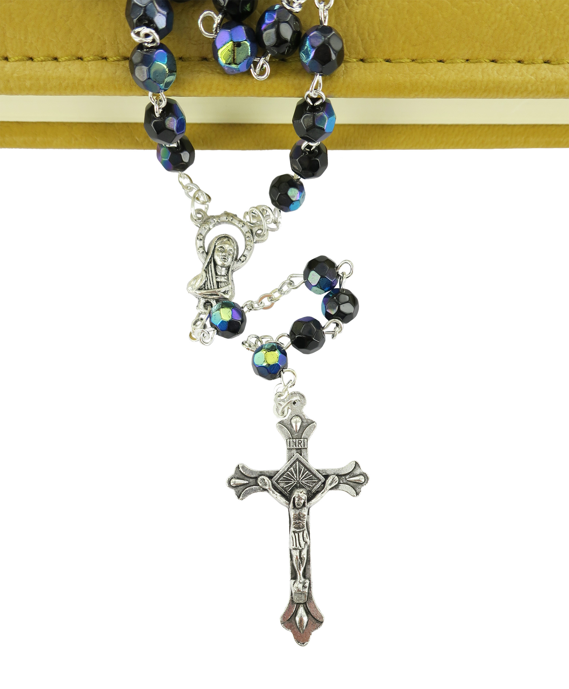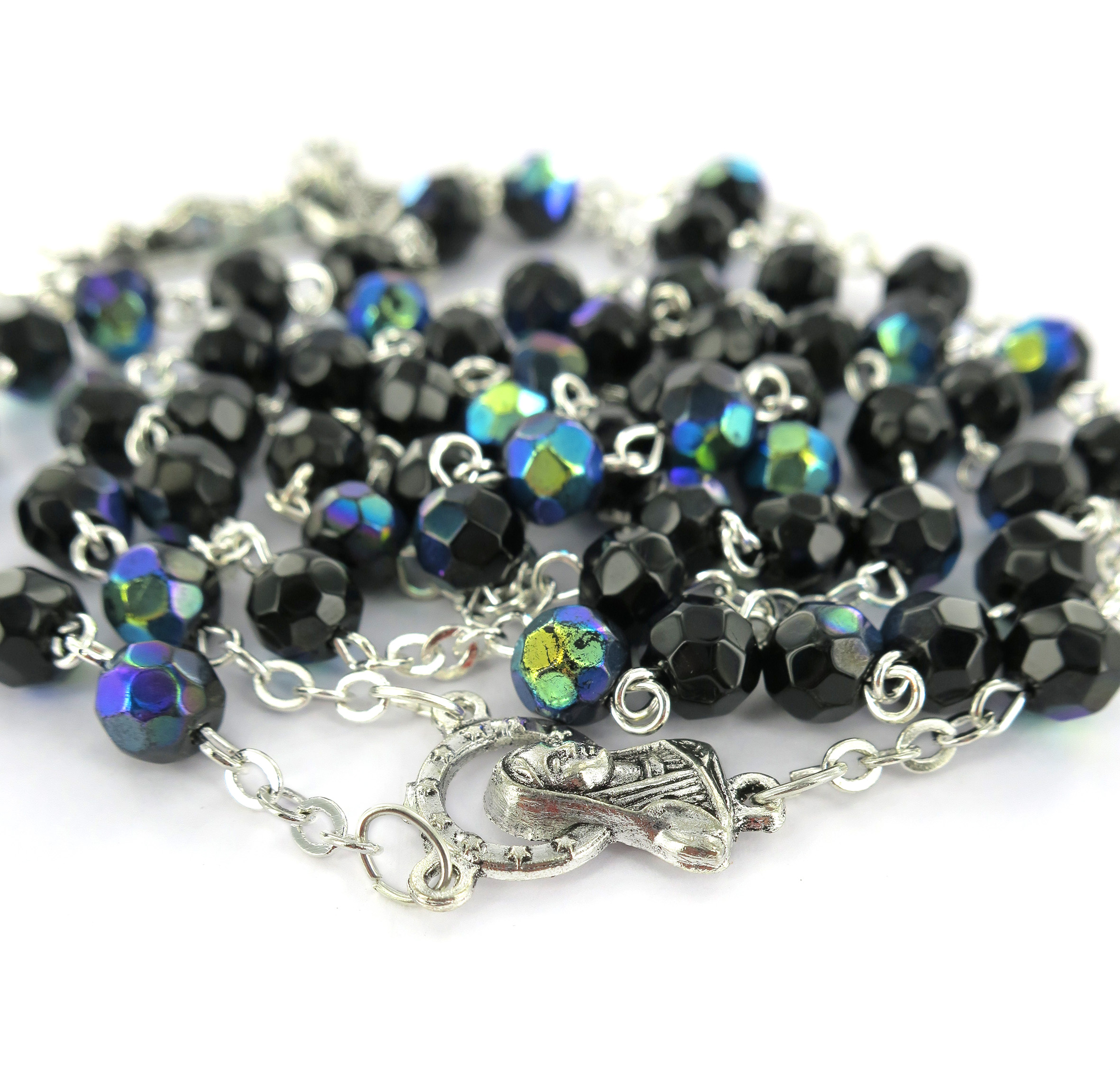 Rosario con grani in semicristallo di colore scarabeo la cui misura è 6 millimetri.