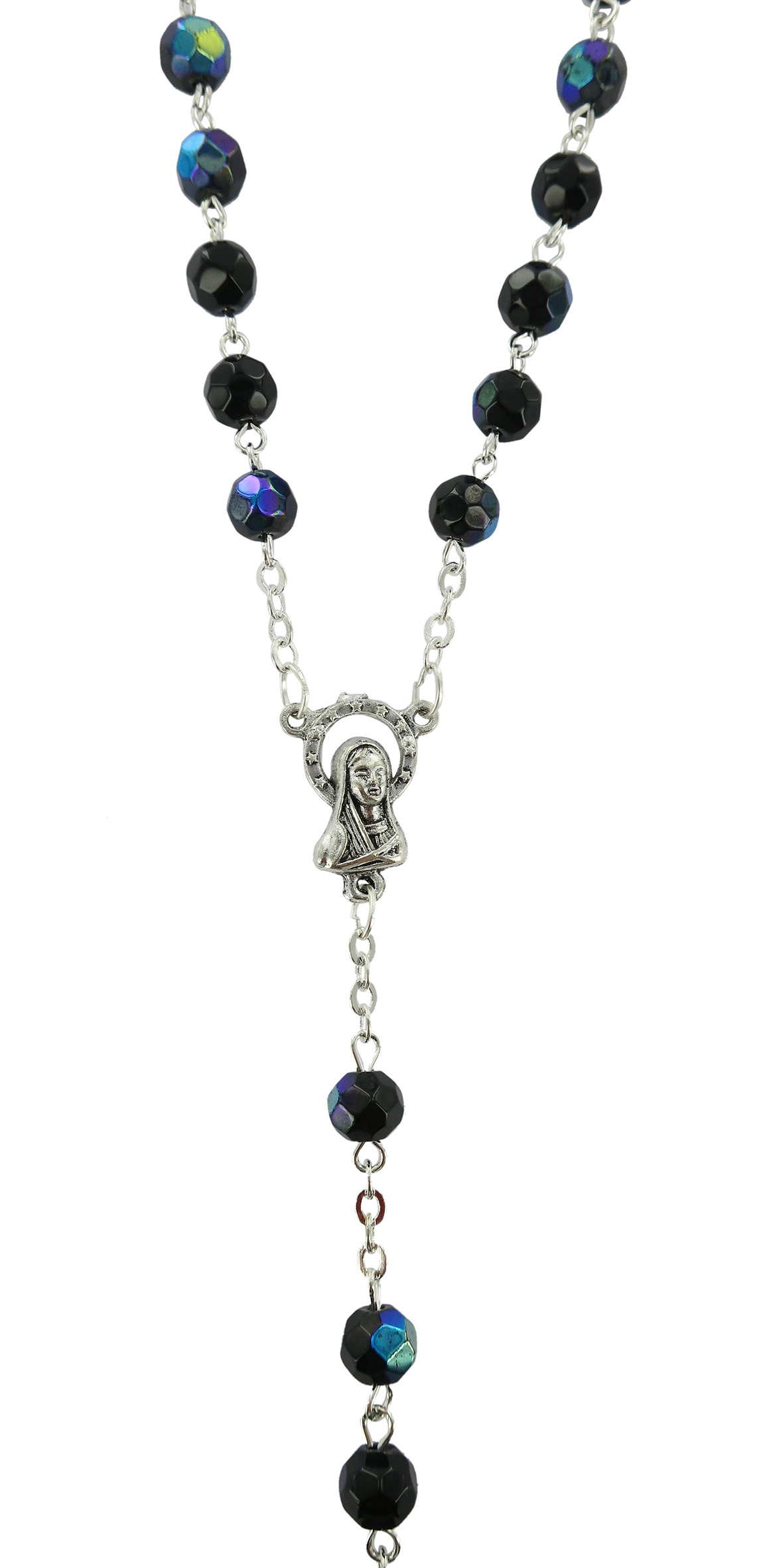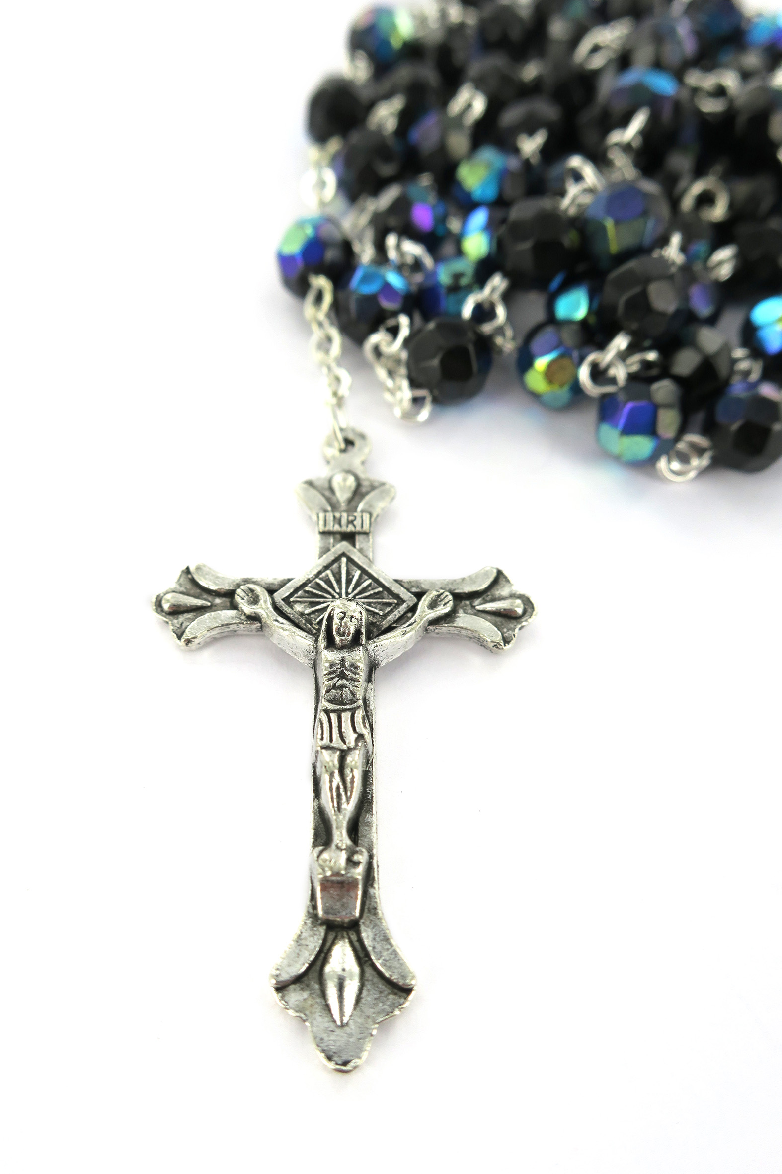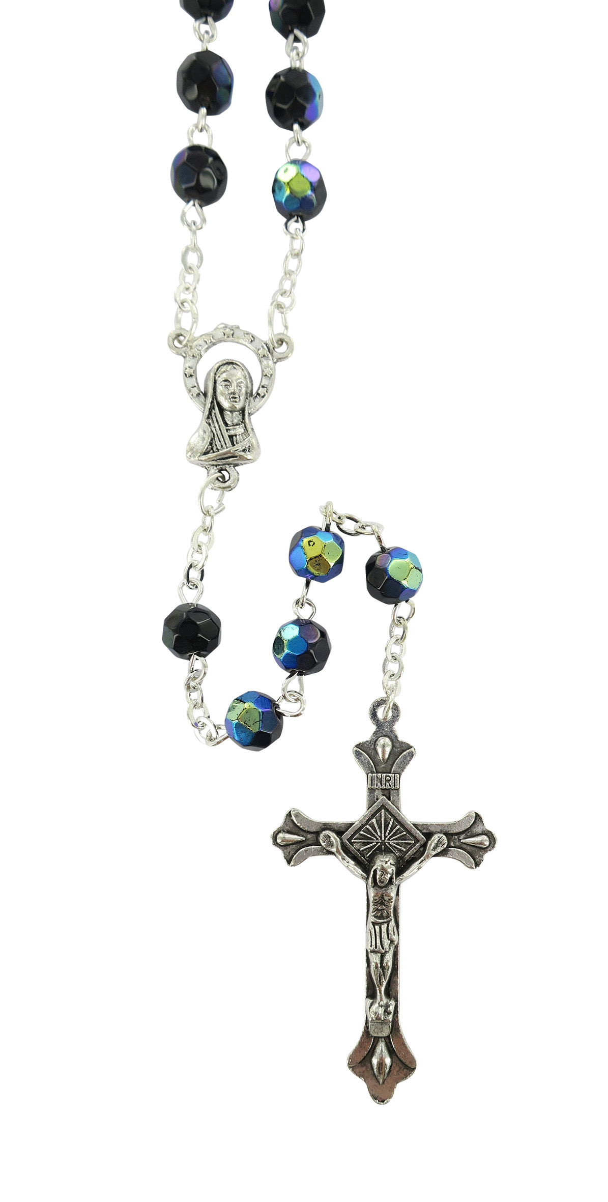 Rosario con grani in semicristallo di colore scarabeo la cui misura è 6 millimetri.