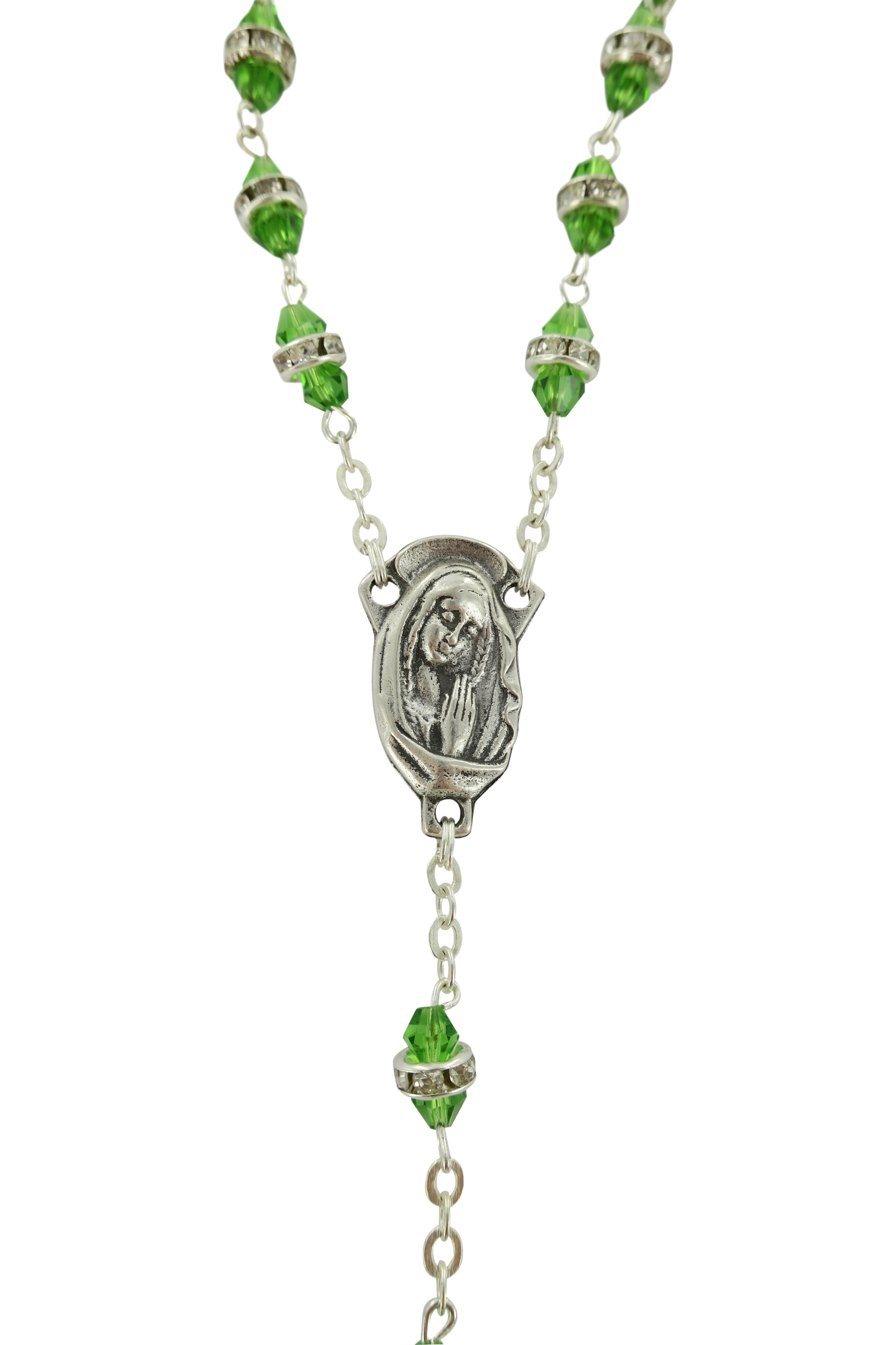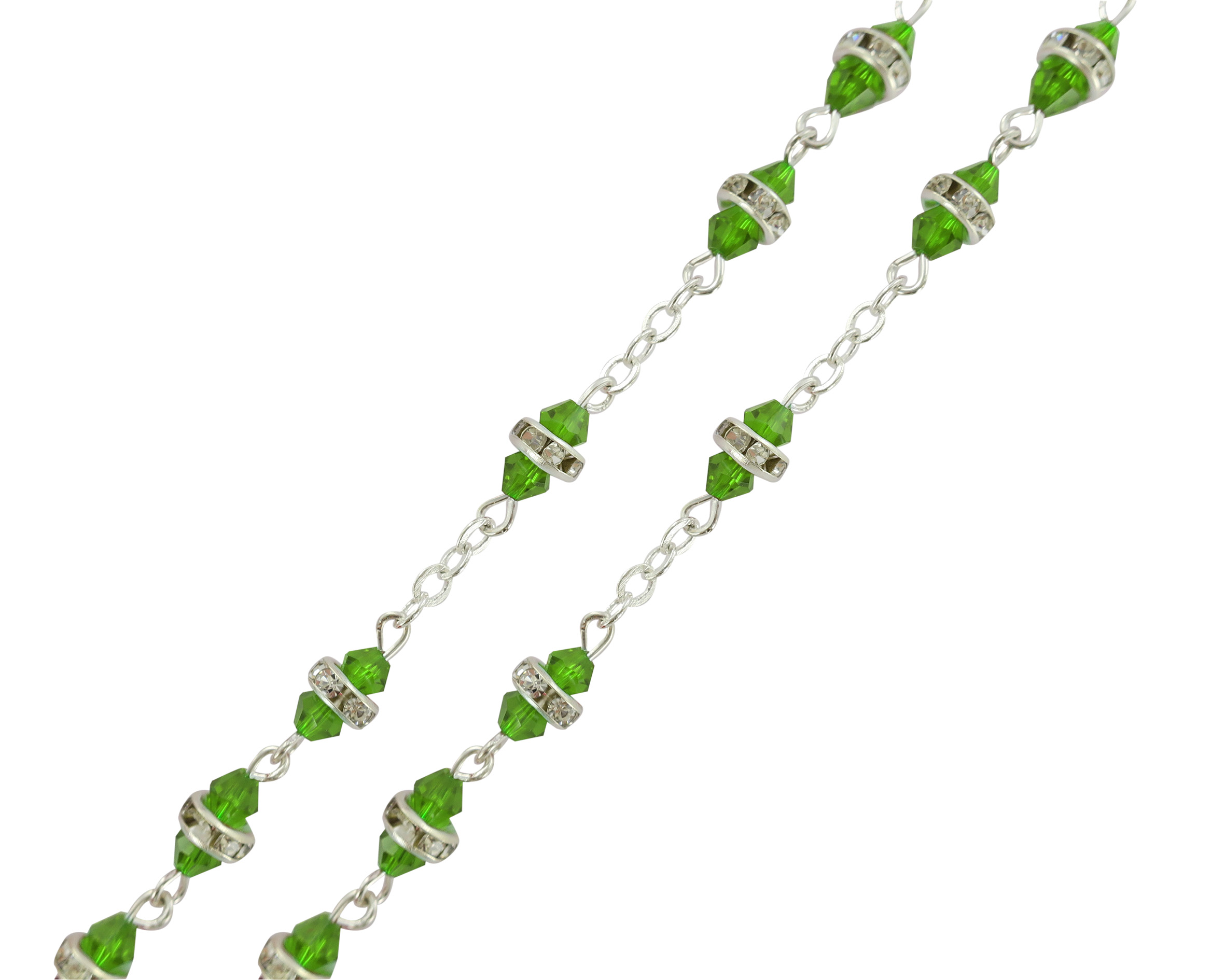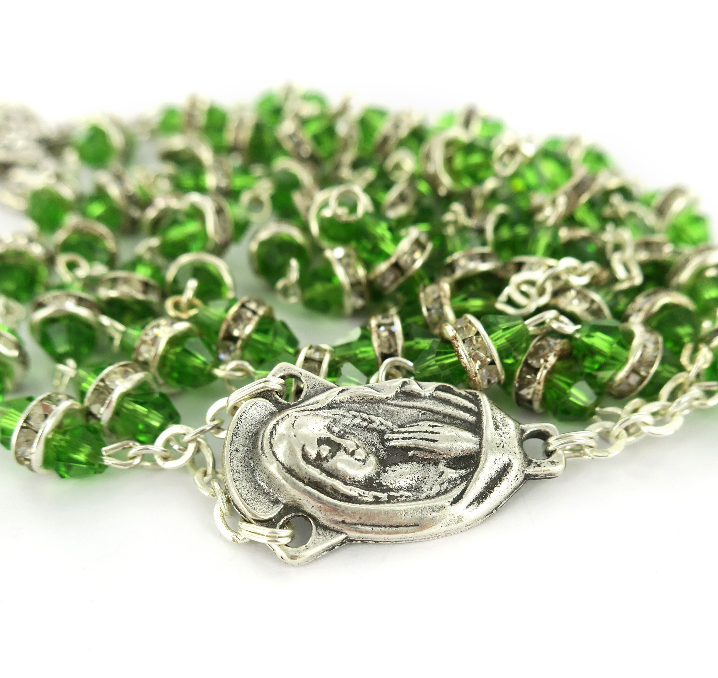 La luminosità di questo rosario,rilegato a mano in metallo argentato, è dovuta ai grani in semicristallo trasparente verde impreziositi da un piccolo anello in strass bianchi.