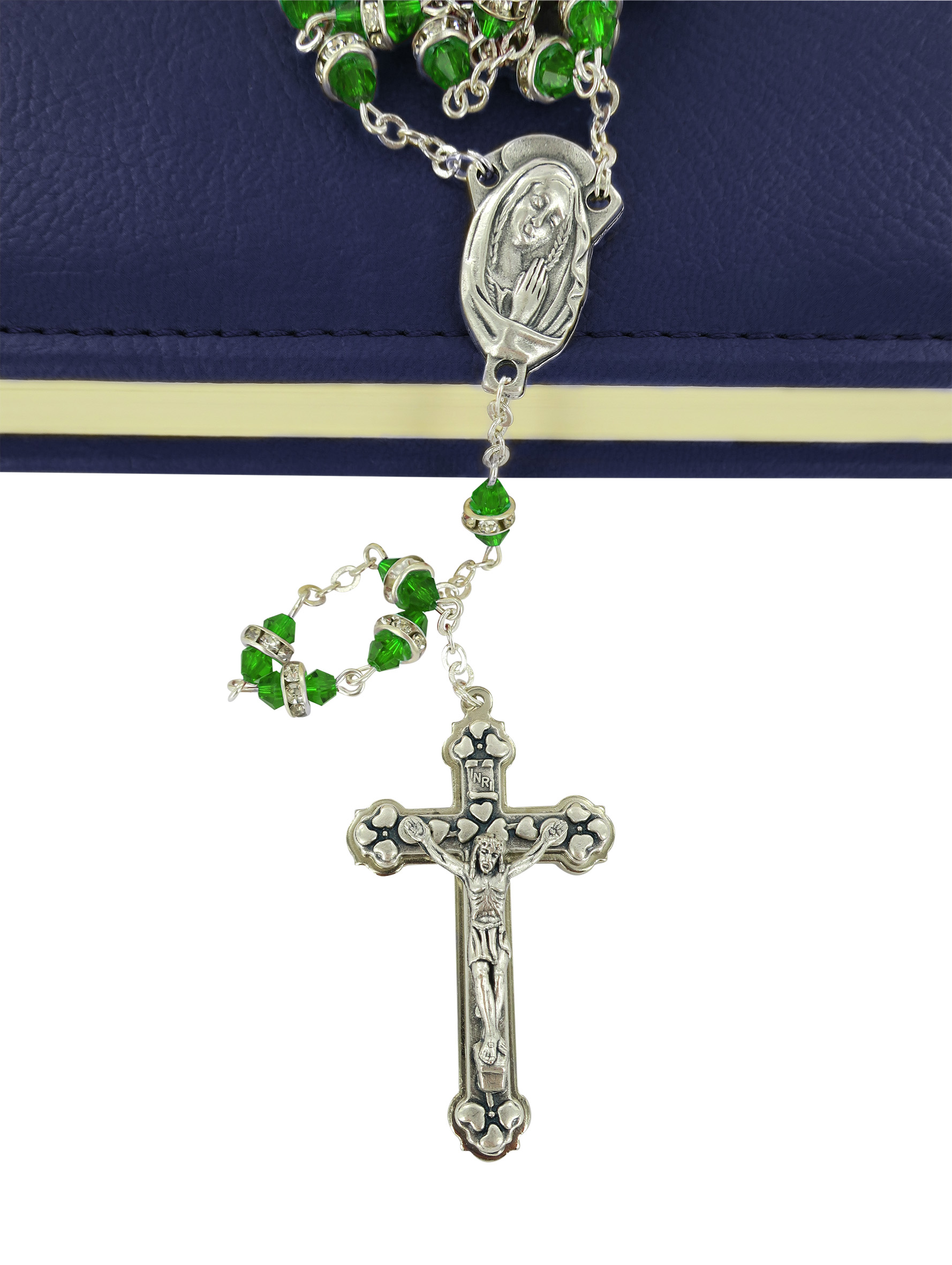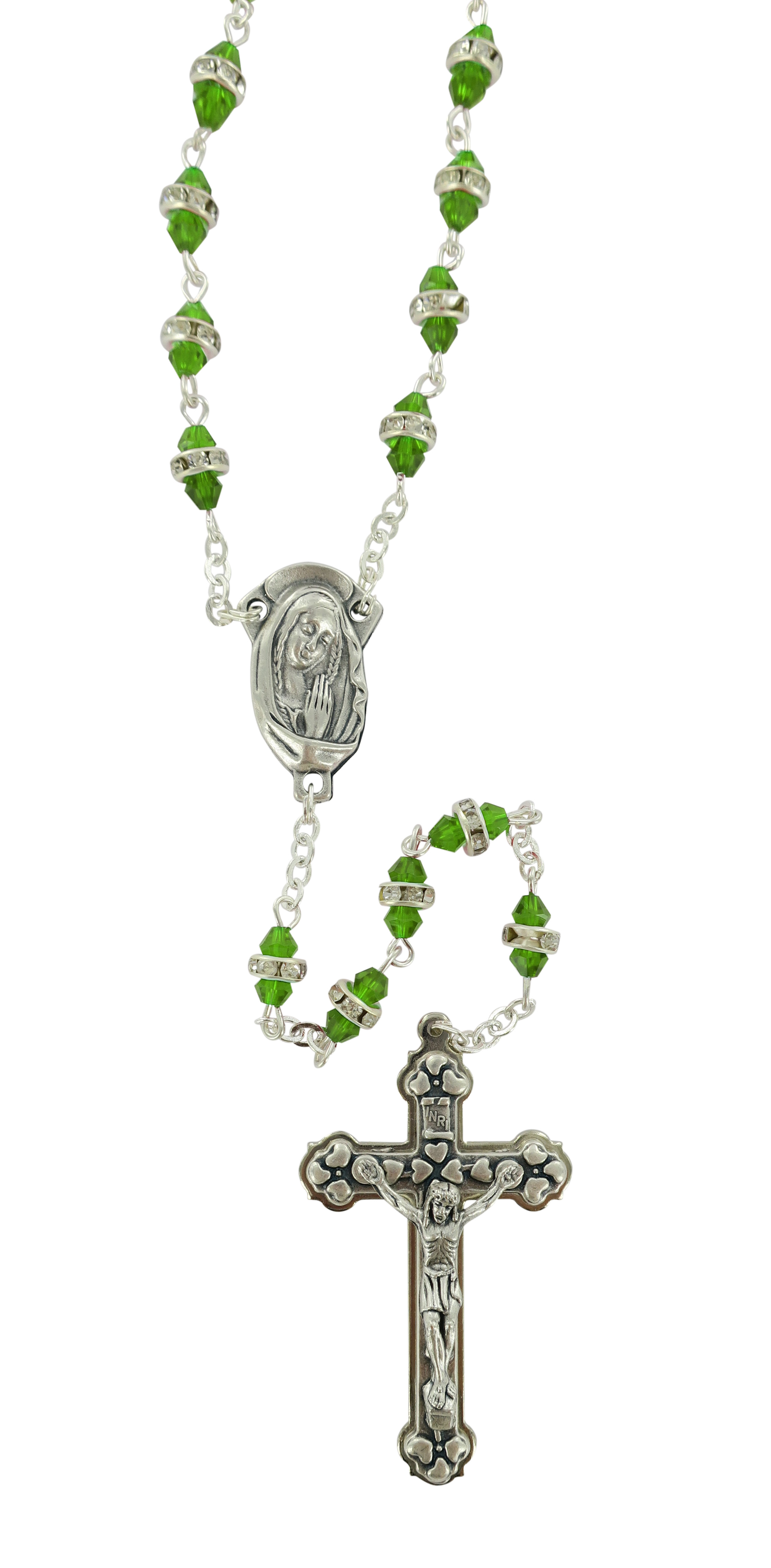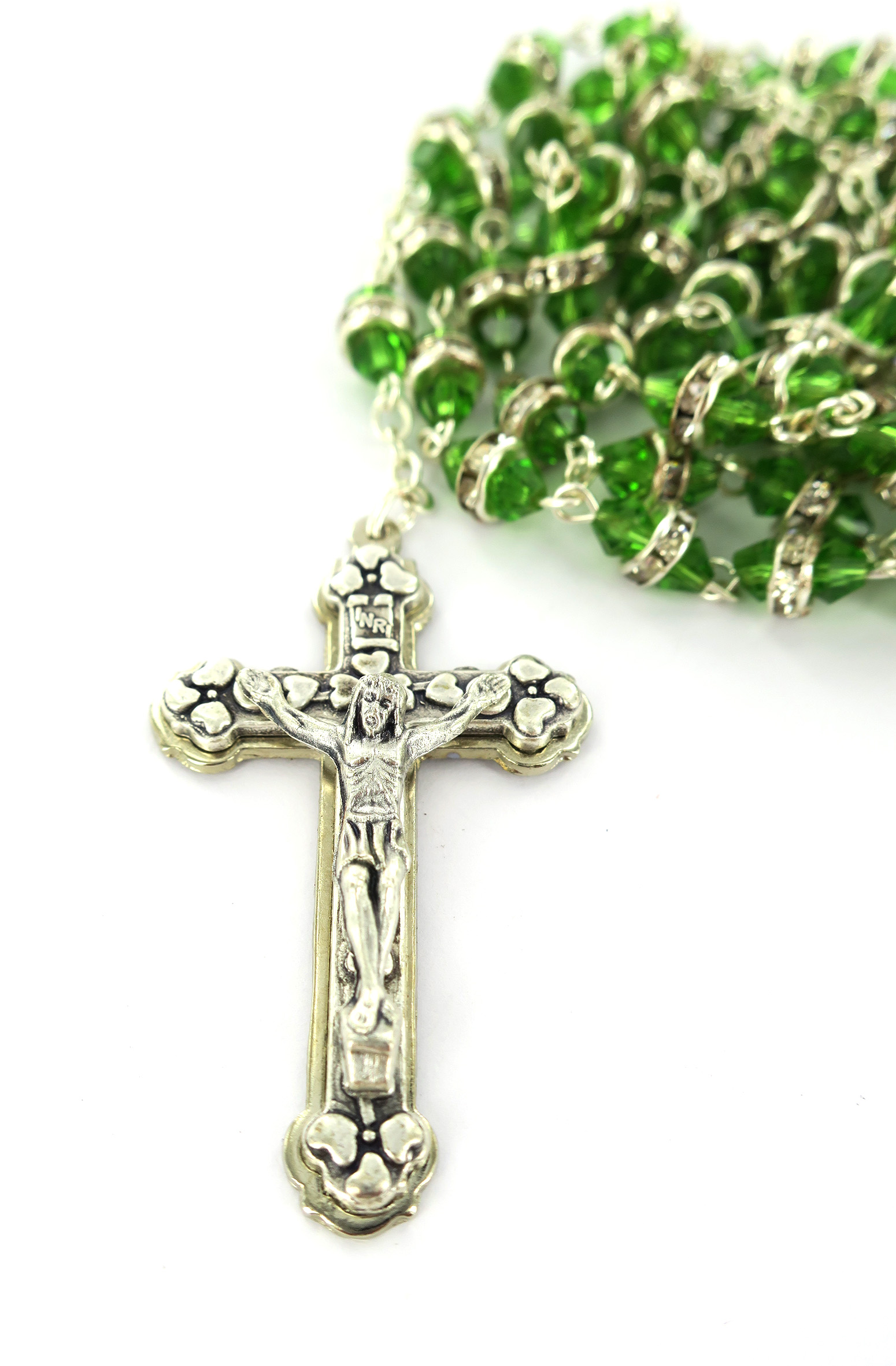 La luminosità di questo rosario,rilegato a mano in metallo argentato, è dovuta ai grani in semicristallo trasparente verde impreziositi da un piccolo anello in strass bianchi.