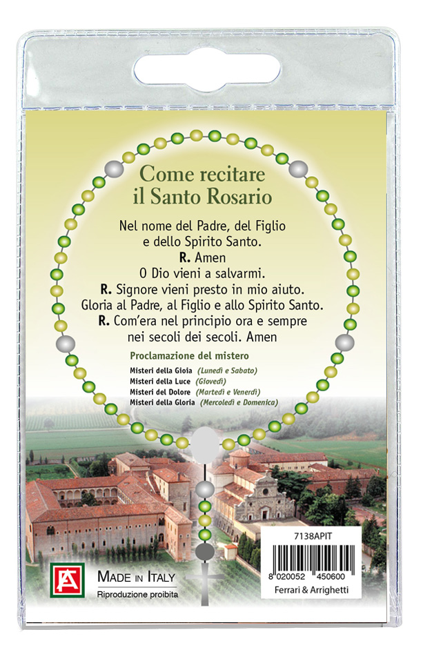 Il blister si presenta con all'interno un cartoncino, rappresentante la foto dell'Abbazia di Praglia (monastero benedettino) ed una decina con grani tondi in legno di mm 4 che, con gancetto si può applicare come ciondolo.