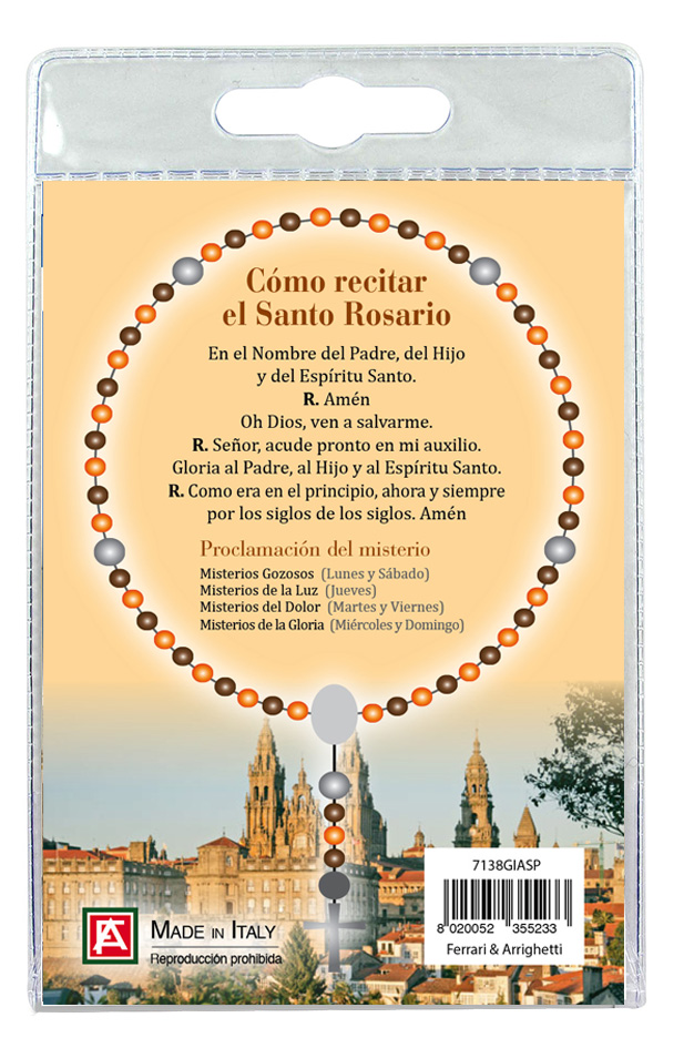 Il blister si presenta con all'interno un cartoncino, rappresentante la foto di San Giacomo il maggiore ed una decina con grani tondi in legno di mm 4 che, con gancetto si può applicare come ciondolo.