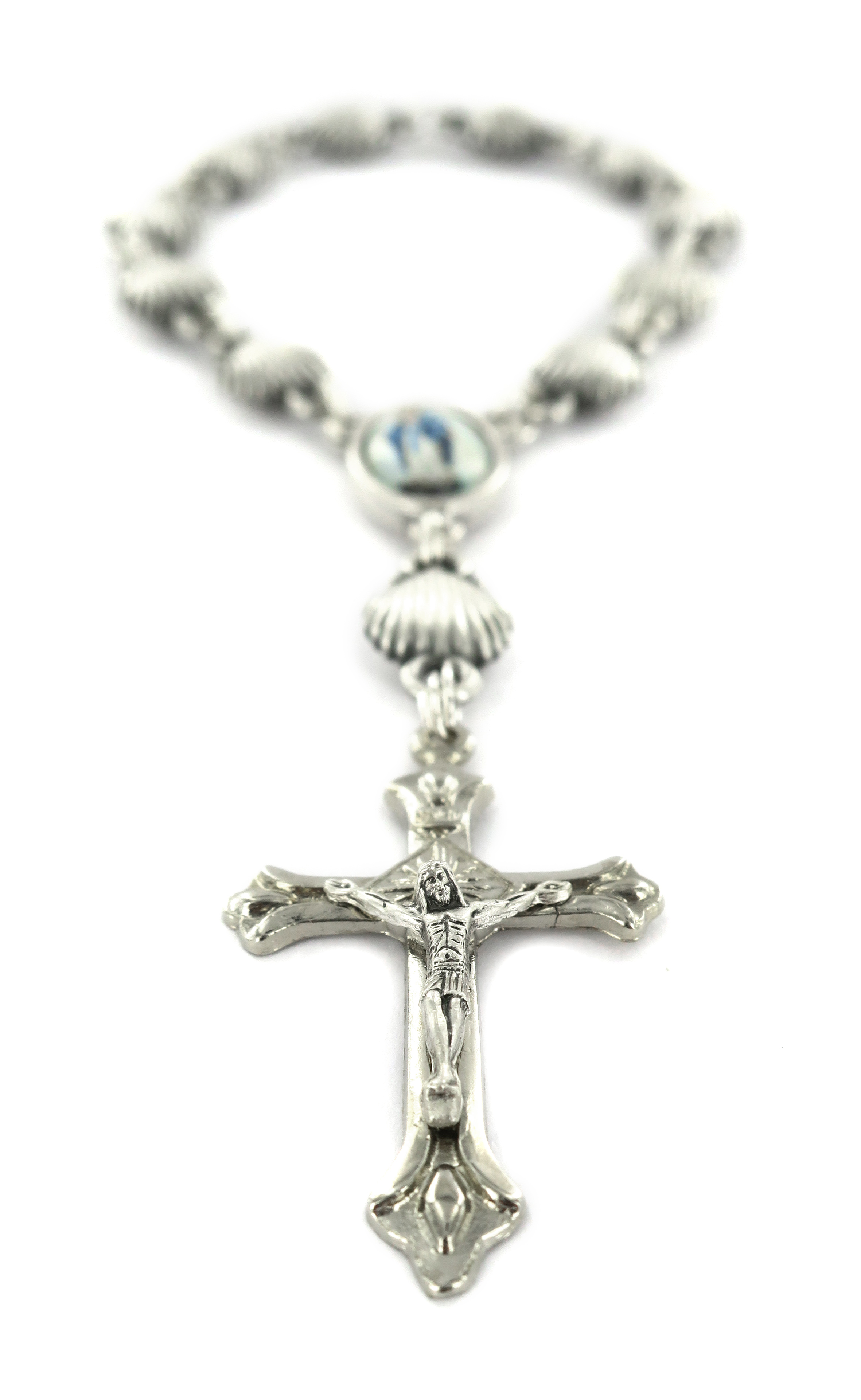 Rosario decina 11 grani conchiglia in metallo con crocera resinata della Madonna