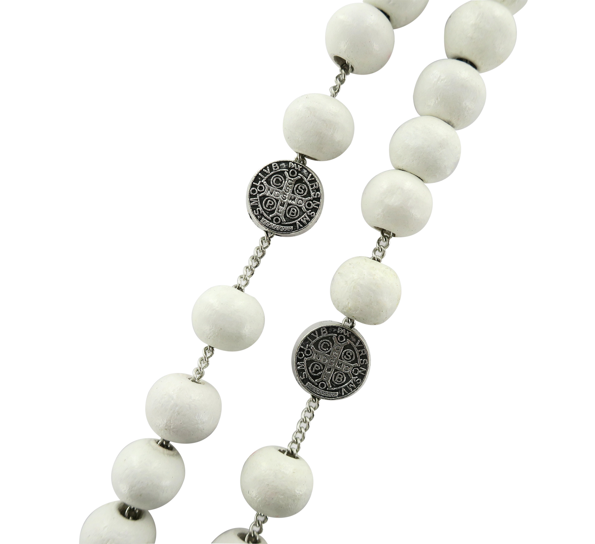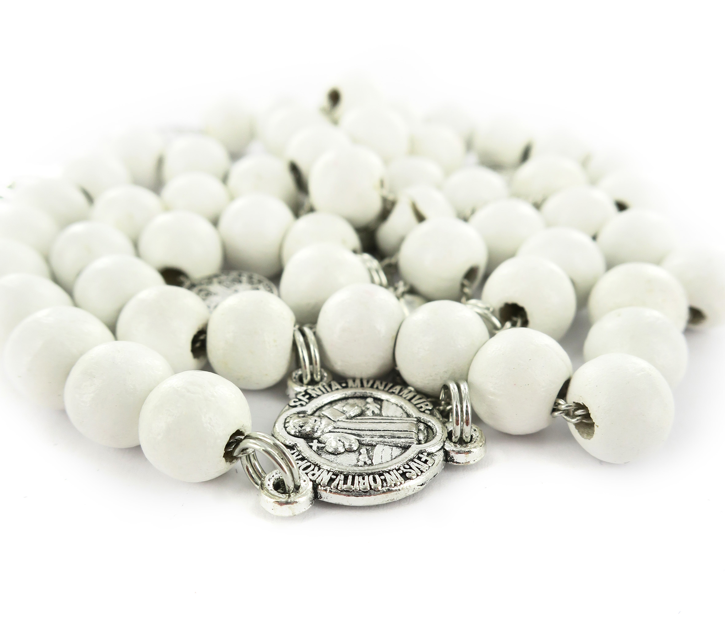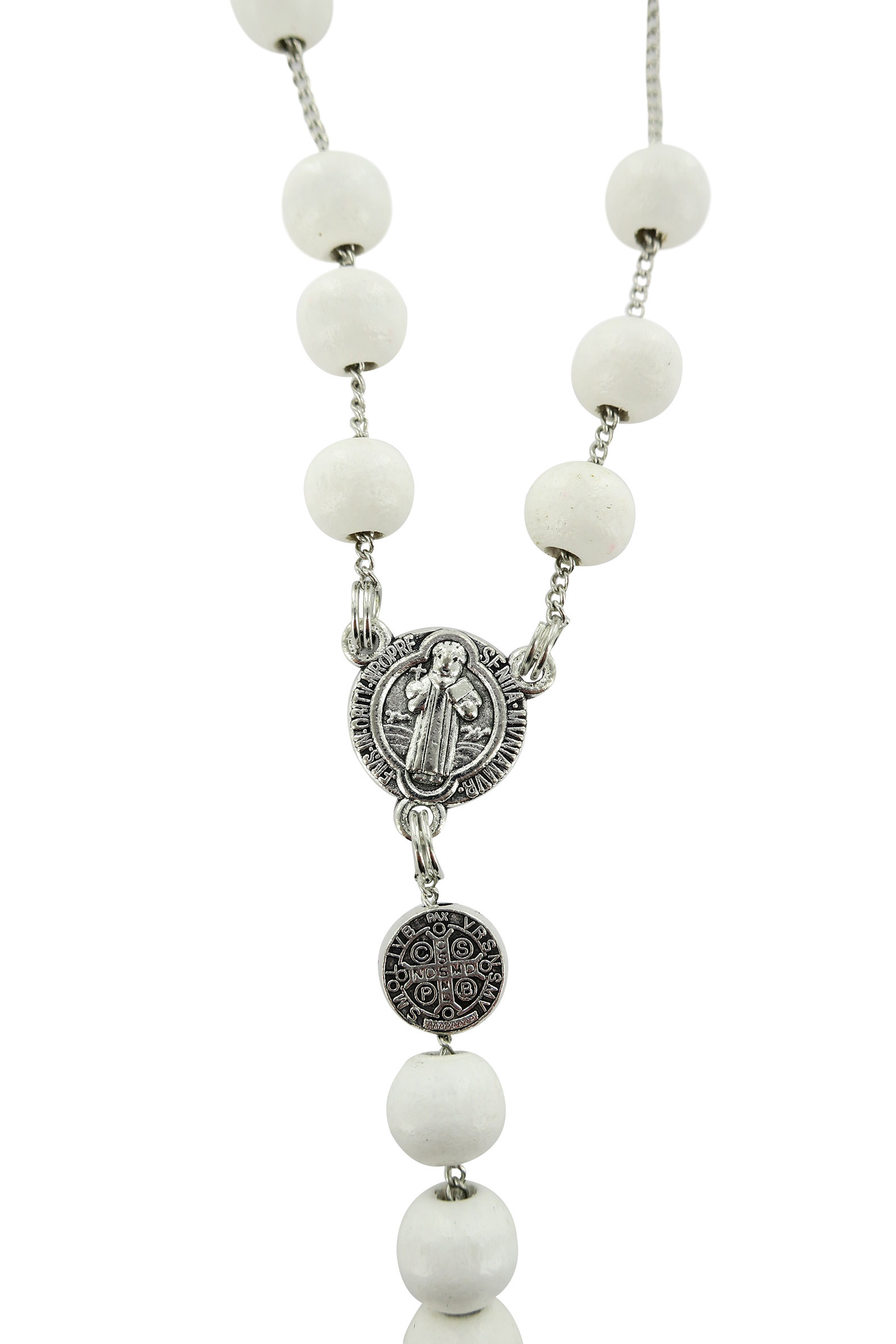 Rosario di San Benedetto in legno tondo bianco diametro 7 mm con Pater e legatura in metallo e chiusura con moschettone
