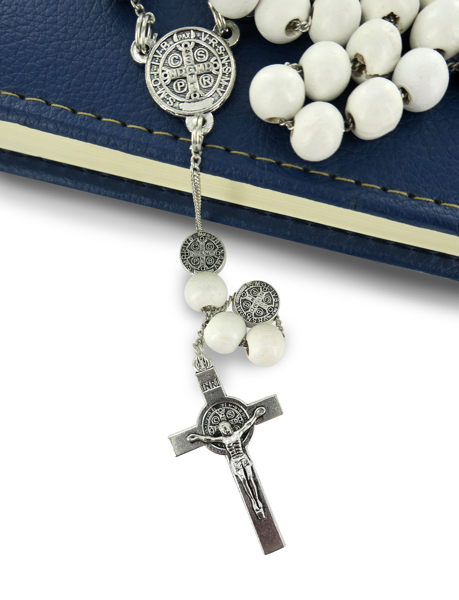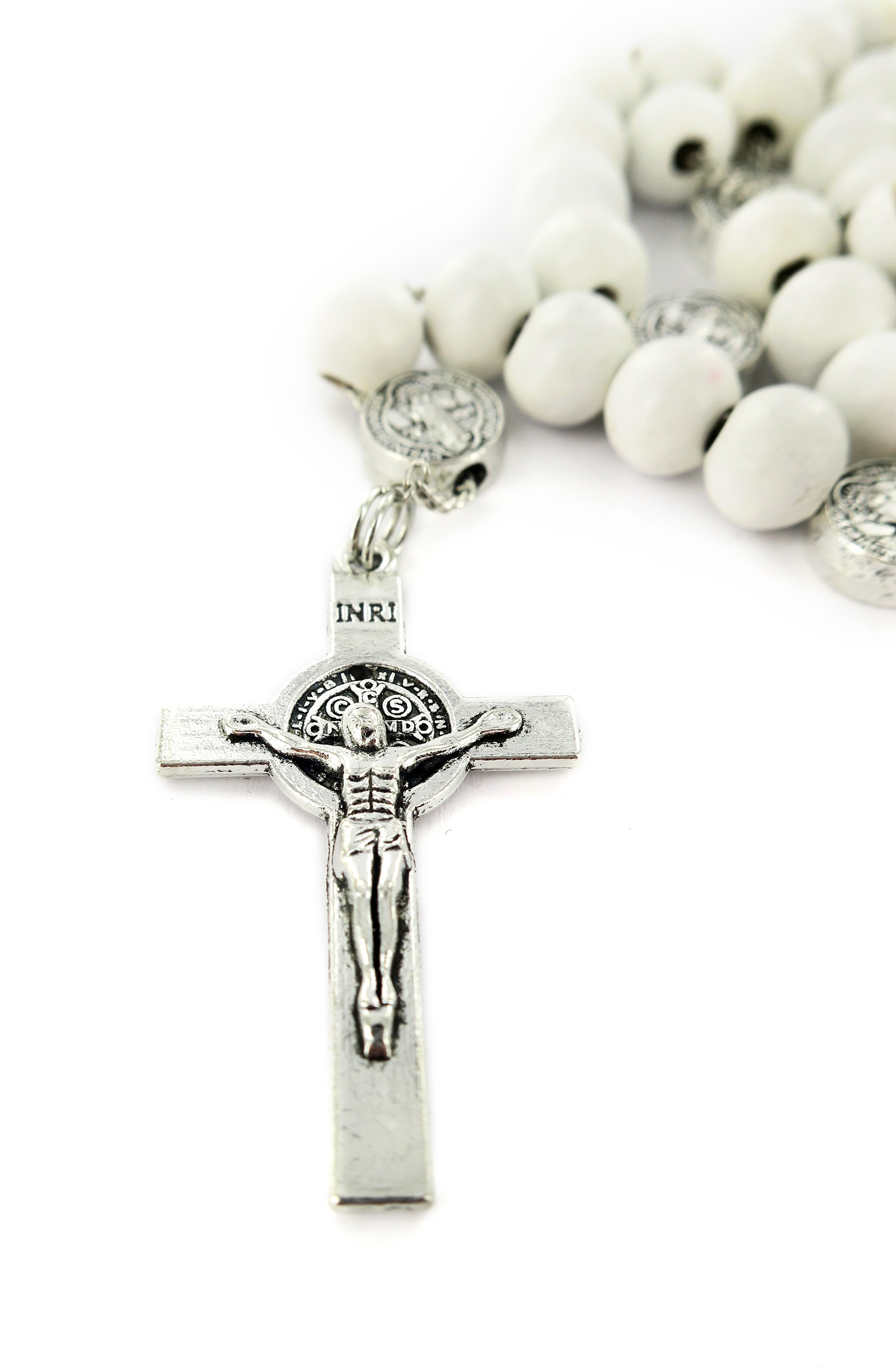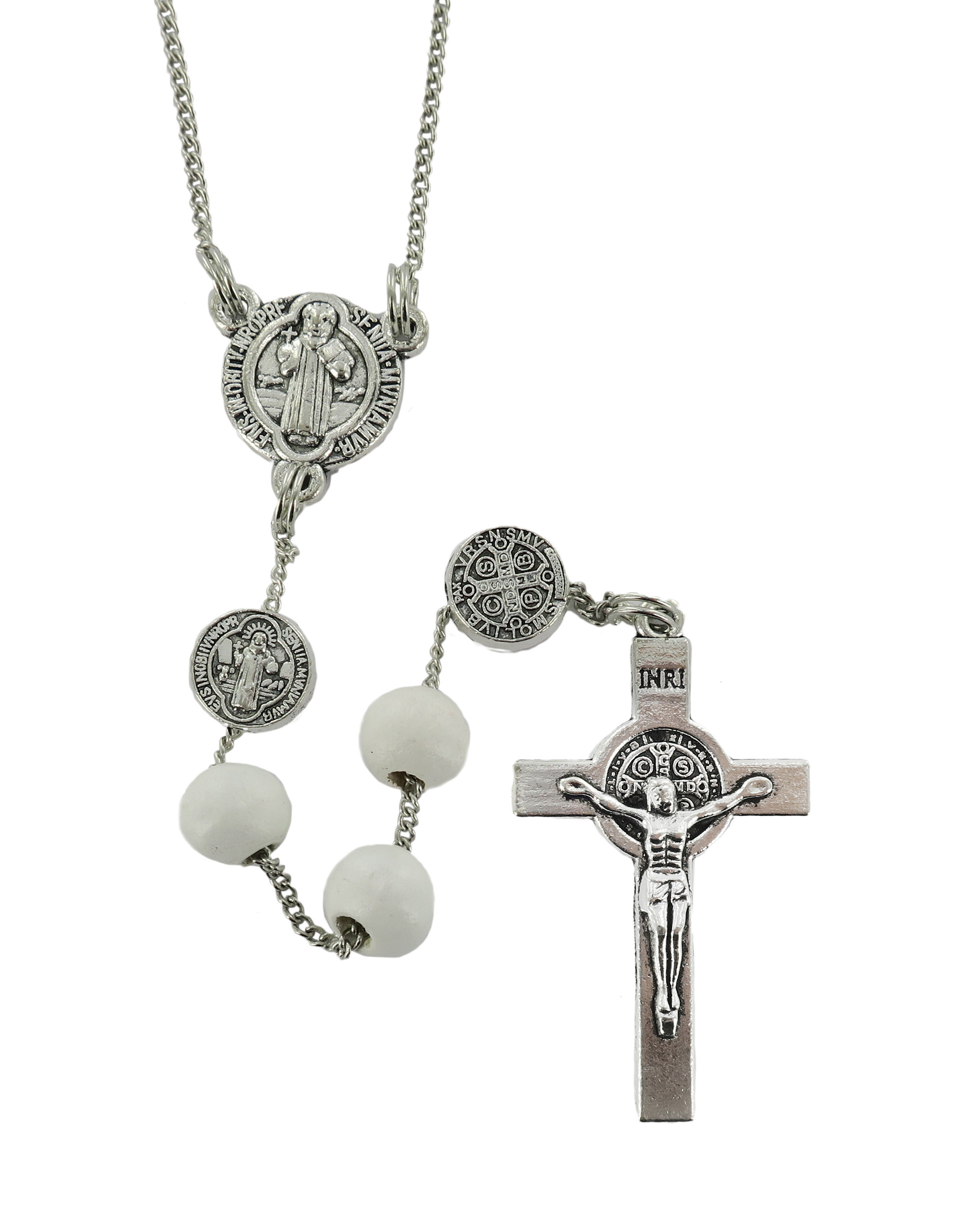 Rosario di San Benedetto in legno tondo bianco diametro 7 mm con Pater e legatura in metallo e chiusura con moschettone
